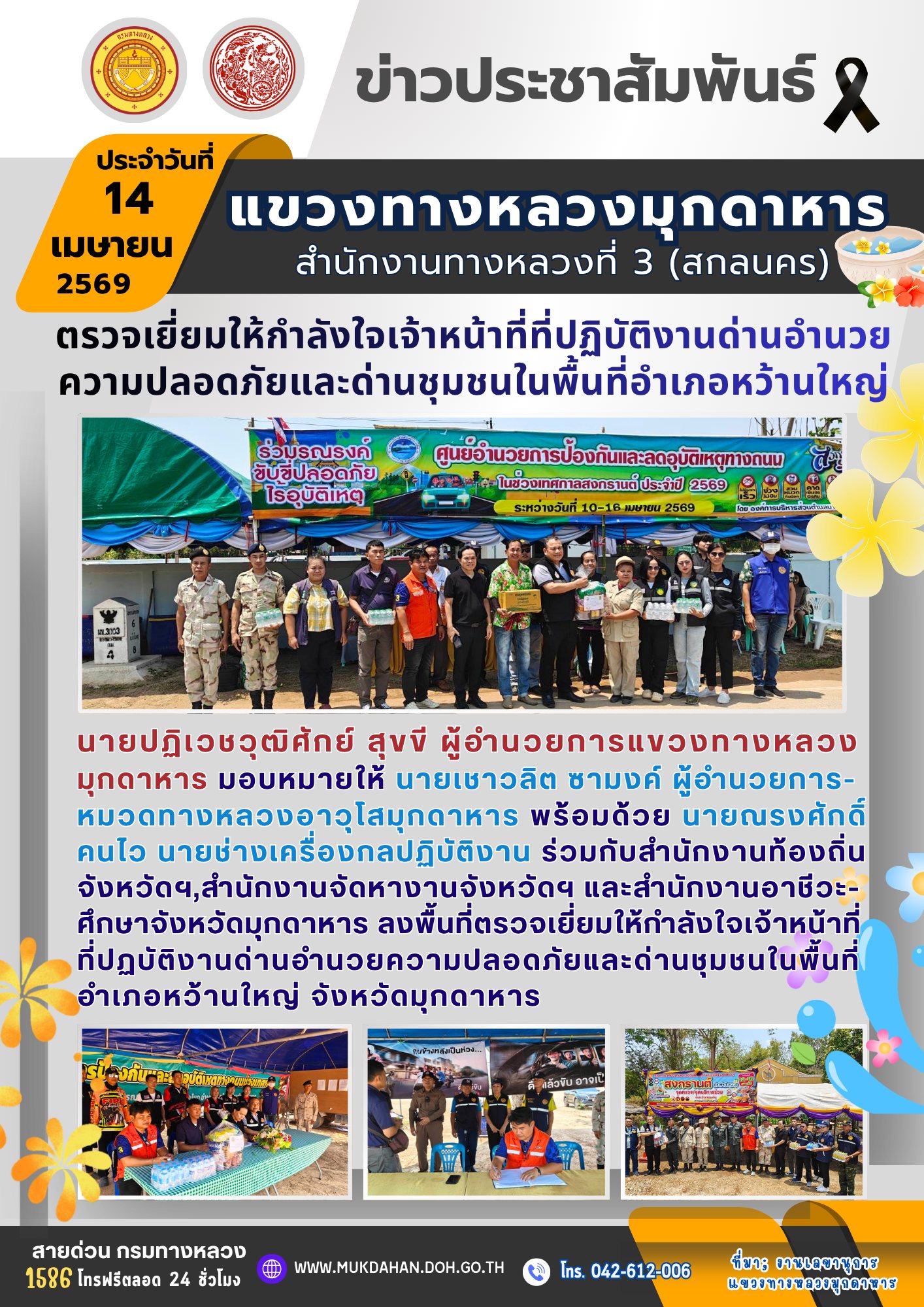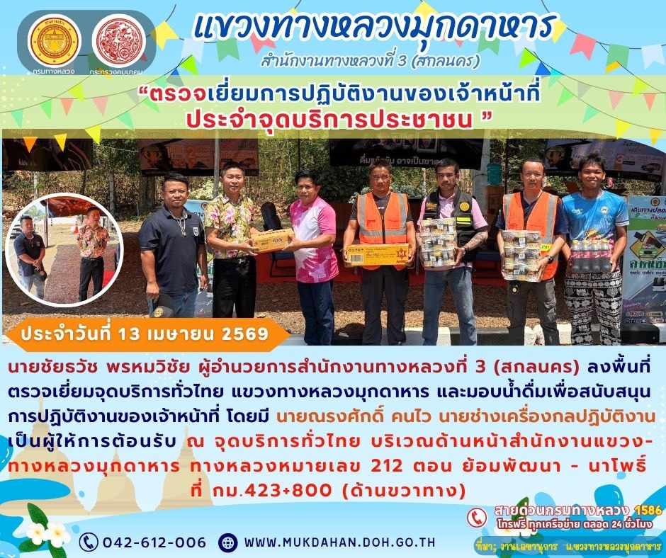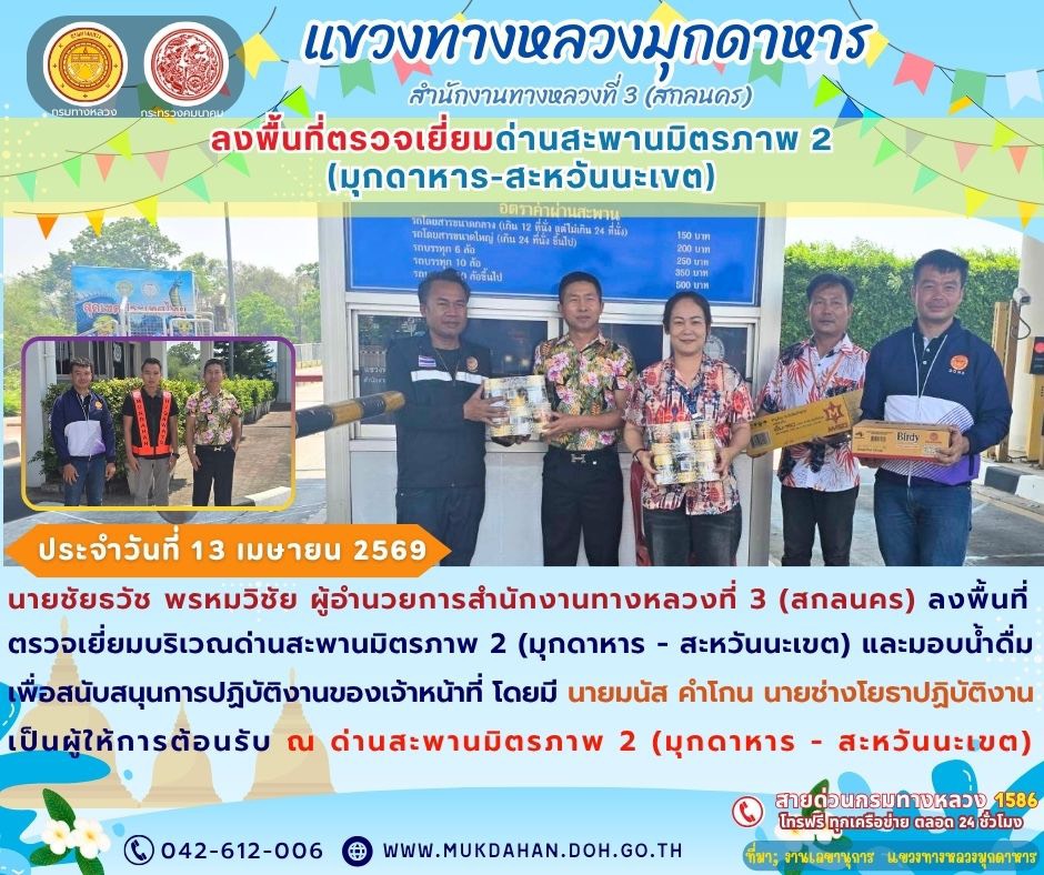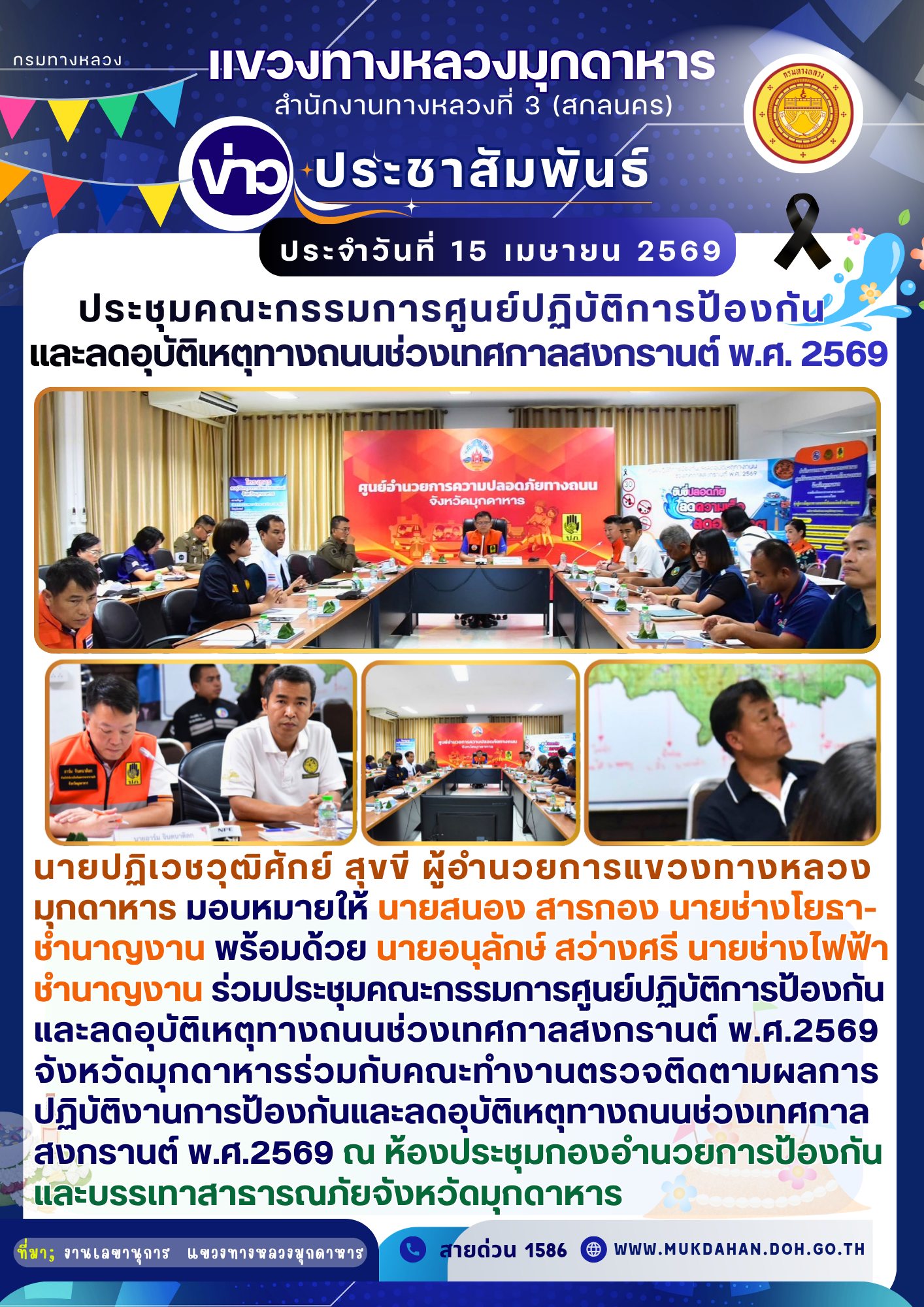 แขวงทางหลวงมุกดาหาร ร่วมประชุมคณะกรรมการศูนย์ปฏิบัติการป้องกัน และลดอุบัติเหตุทางถนนช่วงเทศกาลสงกรานต์ พ.ศ. 2569 จังหวัดมุกมุกดาหาร ร่วมกับคณะทำงานตรวจติดตามผลการปฏิบัติงานการป้องกัน และลดอุบัติเหตุทางถนนช่วงเทศกาลสงกรานต์ พ.ศ. 2569 จังหวัดมุกดาหารครั้งที่ 1/2569 ณ ห้องประชุมกองอำนวยการป้องกัน และบรรเทาสาธารณภัยจังหวัดมุกดาหาร