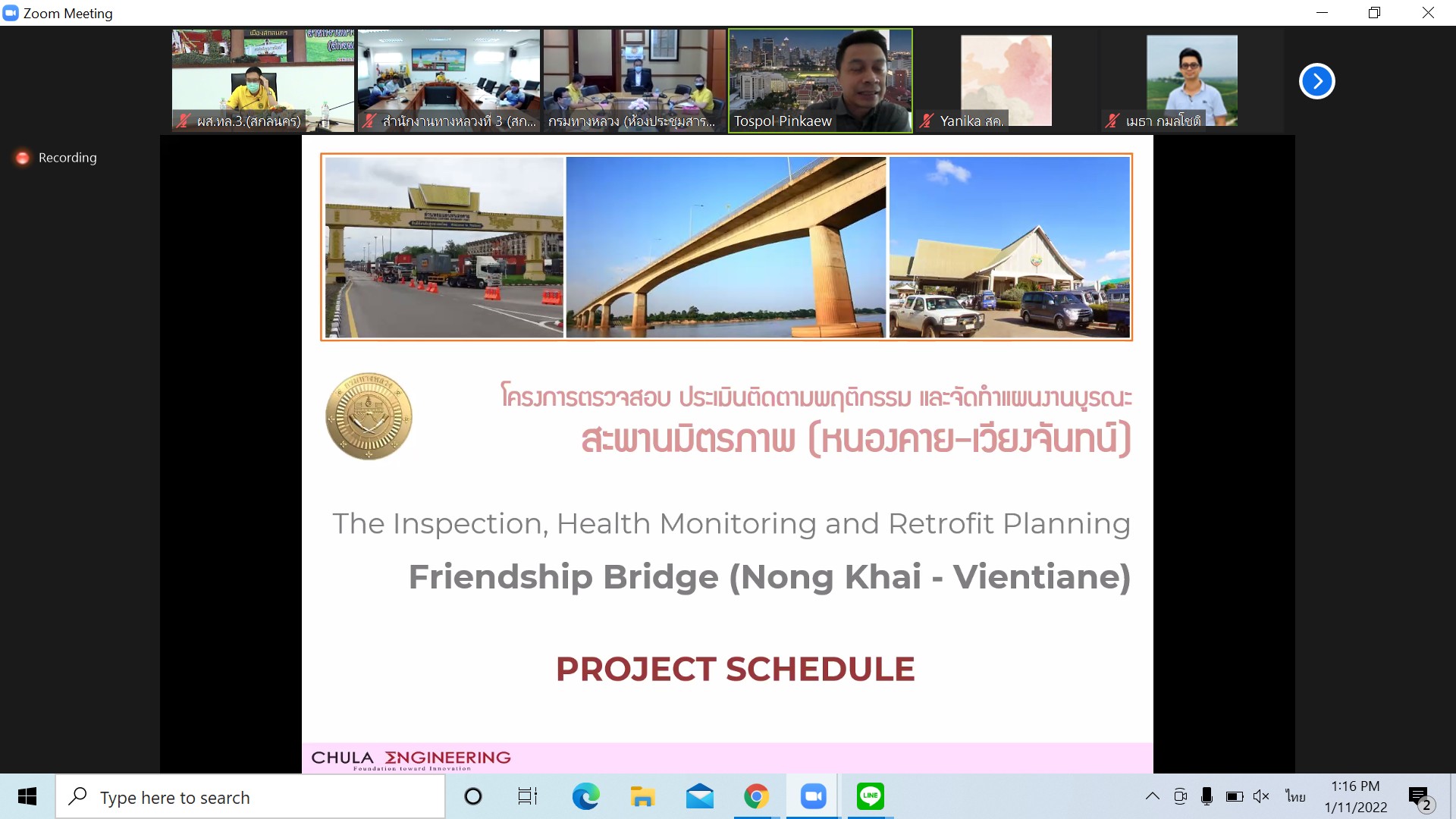 ประชุมเรื่องทดสอบกำลังรับน้ำหนักสะพานมิตรภาพแห่งที่ 1 (หนองคาย-เวียงจันทน์) และจุดพักรถชั่วคราวหนองสองห้อง จังหวัดหนองคาย โดยผ่านระบบ Zoom Cloud Meeting