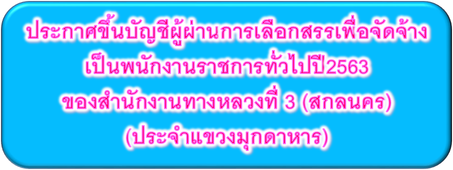 ประกาศขึ้นบัญชีผู้ผ่านการเลือกสรรเพื่อจัดจ้าง เป็นพนักงานราชการทั่วไปปี2563 ของสำนักงานทางหลวงที่ 3 (สกลนคร) (ประจำแขวงมุกดาหาร)