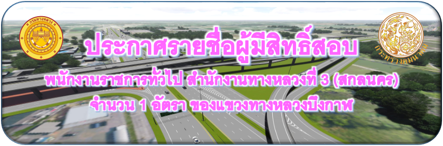 ประกาศรายชื่อผู้มีสิทธิ์สอบ พนักงานราชการทั่วไป สำนักงานทางหลวงที่ 3 (สกลนคร) จำนวน 1 อัตรา ของแขวงทางหลวงบึงกาฬ
