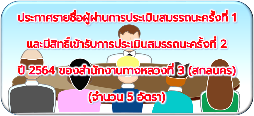 ประกาศรายชื่อผู้ผ่านการประเมินสมรรถนะครั้งที่ 1 และมีสิทธิ์เข้ารับการประเมินสมรรถนะครั้งที่ 2 ปี 2564 ของ สทล.3(สกลนคร) จำนวน 5 อัตรา