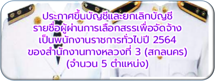 ประกาศขึ้นบัญชีและยกเลิกบัญชีรายชื่อผู้ผ่านการเลือกสรรเป็นพนักงานราชการทั่วไปปี 2564 ของสำนักงานทางหลวงที่ 3 (สกลนคร) จำนวน 5ตำแหน่ง