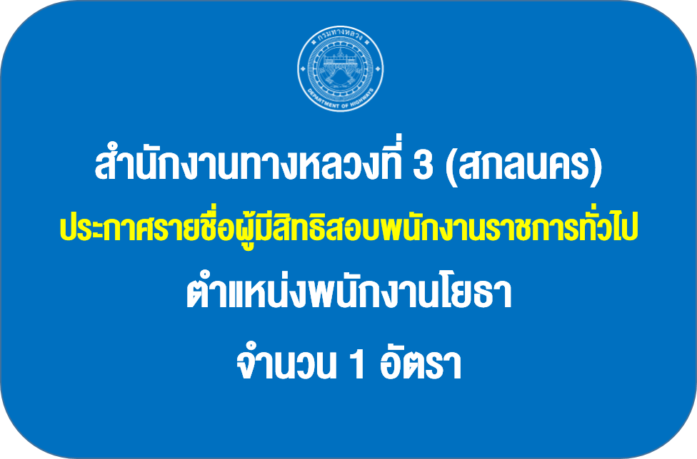 สำนักงานทางหลวงที่ 3 (สกลนคร) ประกาศรายชื่อผู้มีสิทธิสอบพนักงานราชการทั่วไป ตำแหน่งพนักงานโยธาจำนวน 1 อัตรา