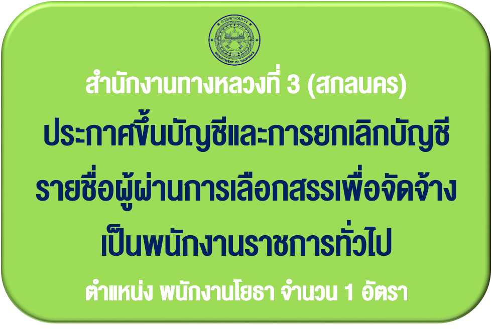 ประกาศขึ้นบัญชีและการยกเลิกบัญชีรายชื่อผู้ผ่านการเลือกสรรเพื่อจัดจ้างเป็นพนักงานราชการทั่วไป ตำแหน่งพนักงานโยธา จำนวน 1 อัตรา