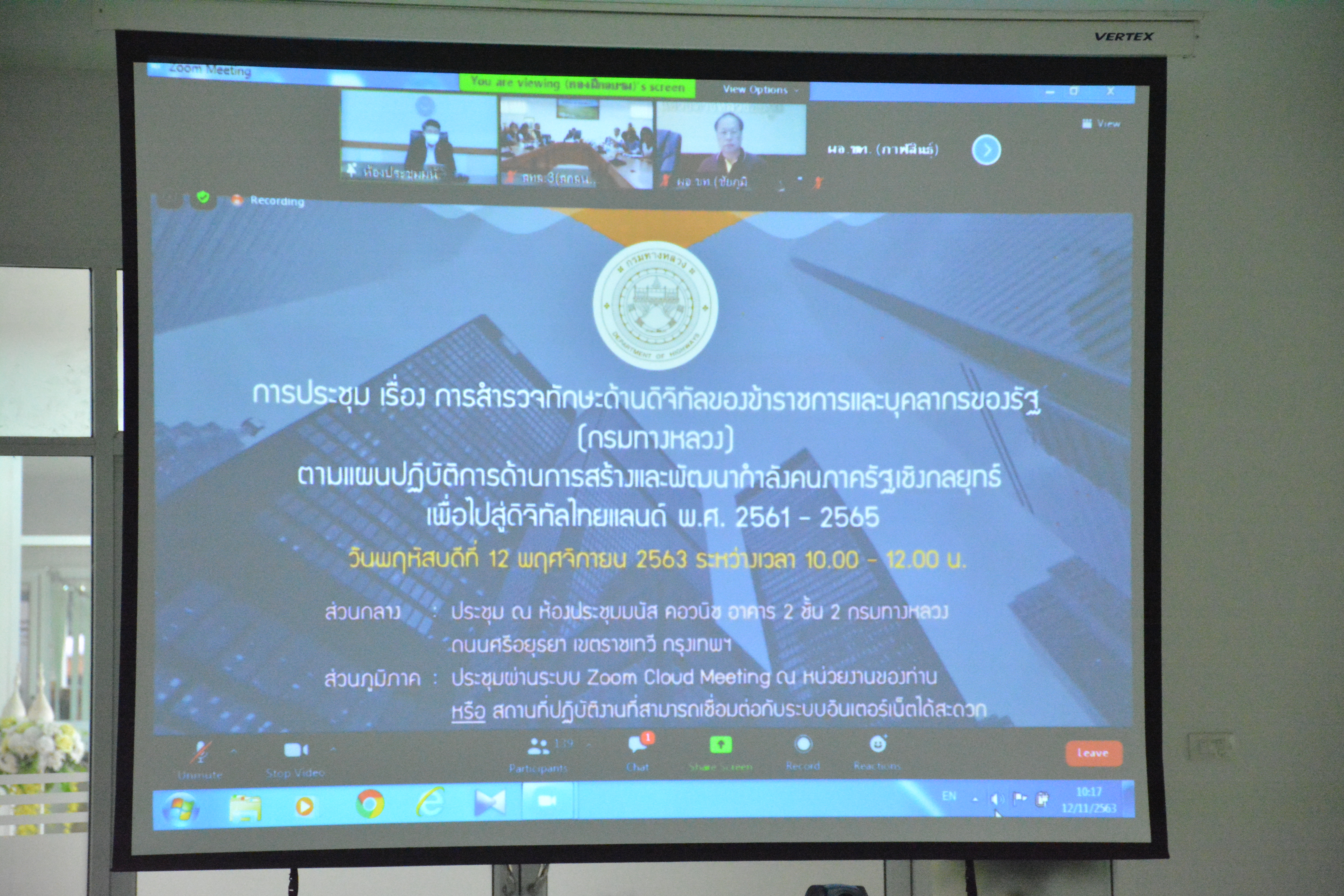 วันที่ 12 พฤศจิกายน 2563 ณ ห้องประชุมสำนักงานทางหลวงที่ 3 (สกลนคร) อาคารหลังใหม่ เวลา 10.00 น-12.00น.นายพัลลภ จันทร์งามปภากูล ผู้อำนวยการสำนักงานทางหลวงที่ 3 พร้อมด้วยผู้อำนวยการแขวงทางหลวงในสังกัด ,รองผู้อำนวยการแขวงทางหลวงในสังกัด และผู้อำนวยการส่วน/ฝ่าย/งาน ร่วมประชุมทางไกลผ่านระบบ Zoom Meeting จากห้องประชุมมนัส คอวนิช กรมทางหลวง กรุงเทพมหานคร เรื่องการสำรวจทักษะด้านดิจิทัลของข้าราชการและบุคลากรของรัฐ (กรมทางหลวง) ตามแผนปฎิบัติการด้านการสร้างและพัฒนากำลังคนภาครัฐเชิงกลยุทธ์เพื่อไปสู่ดิจิทัลไทยแลนด์ พ.ศ. 2561 - 2565