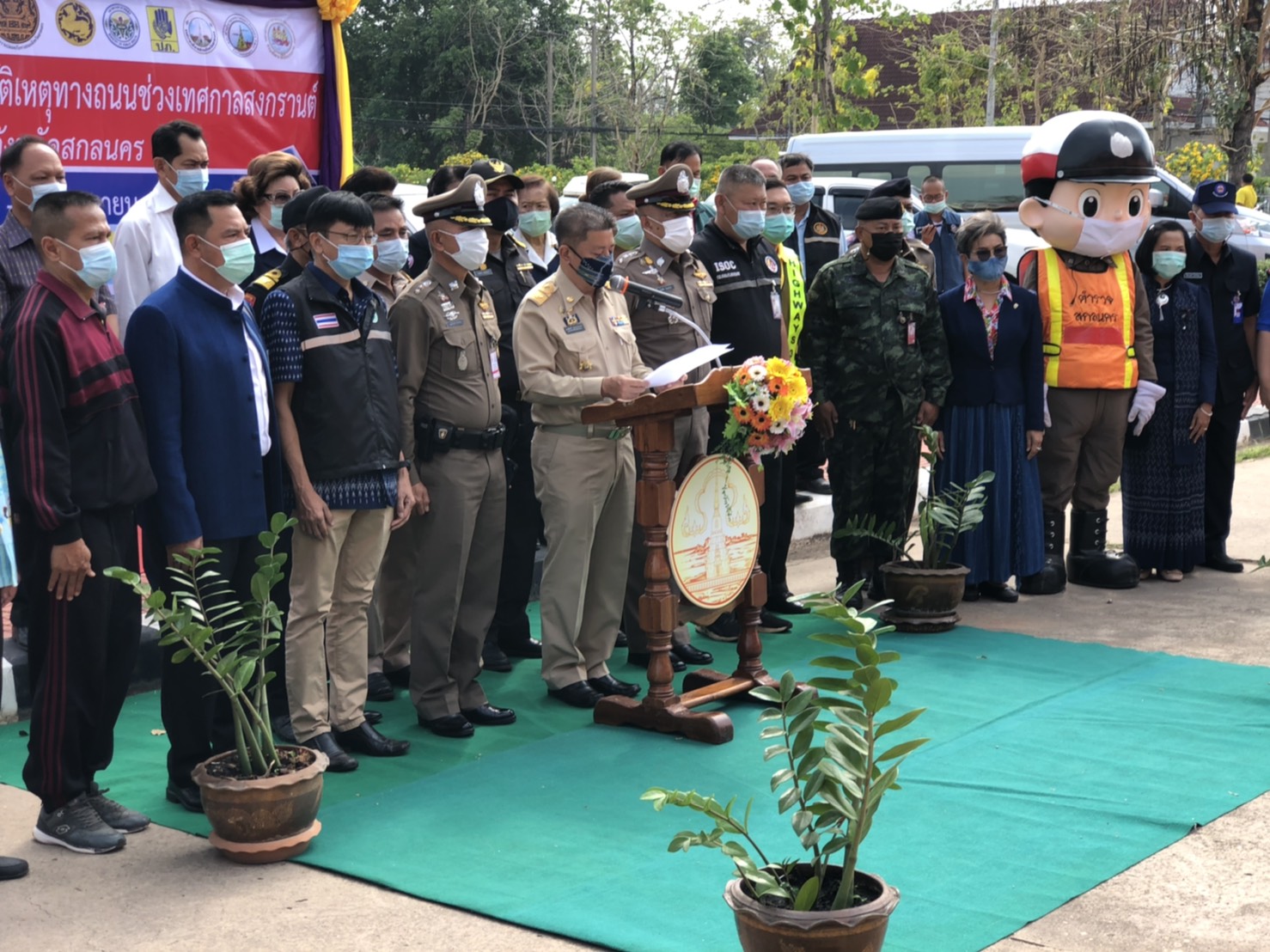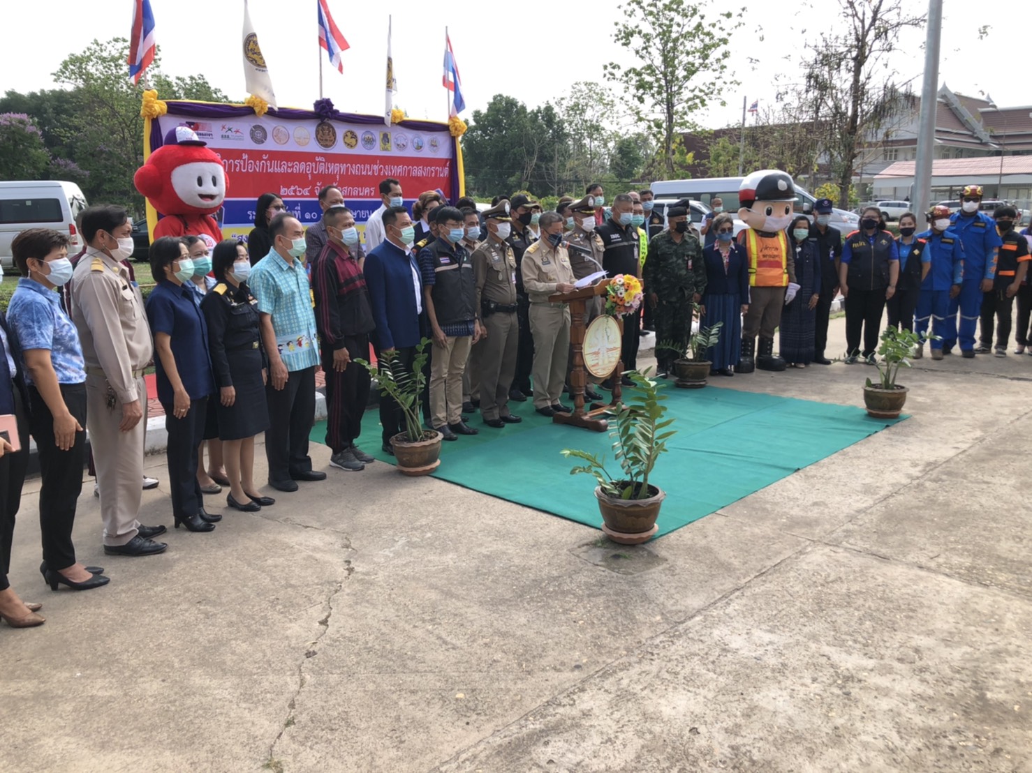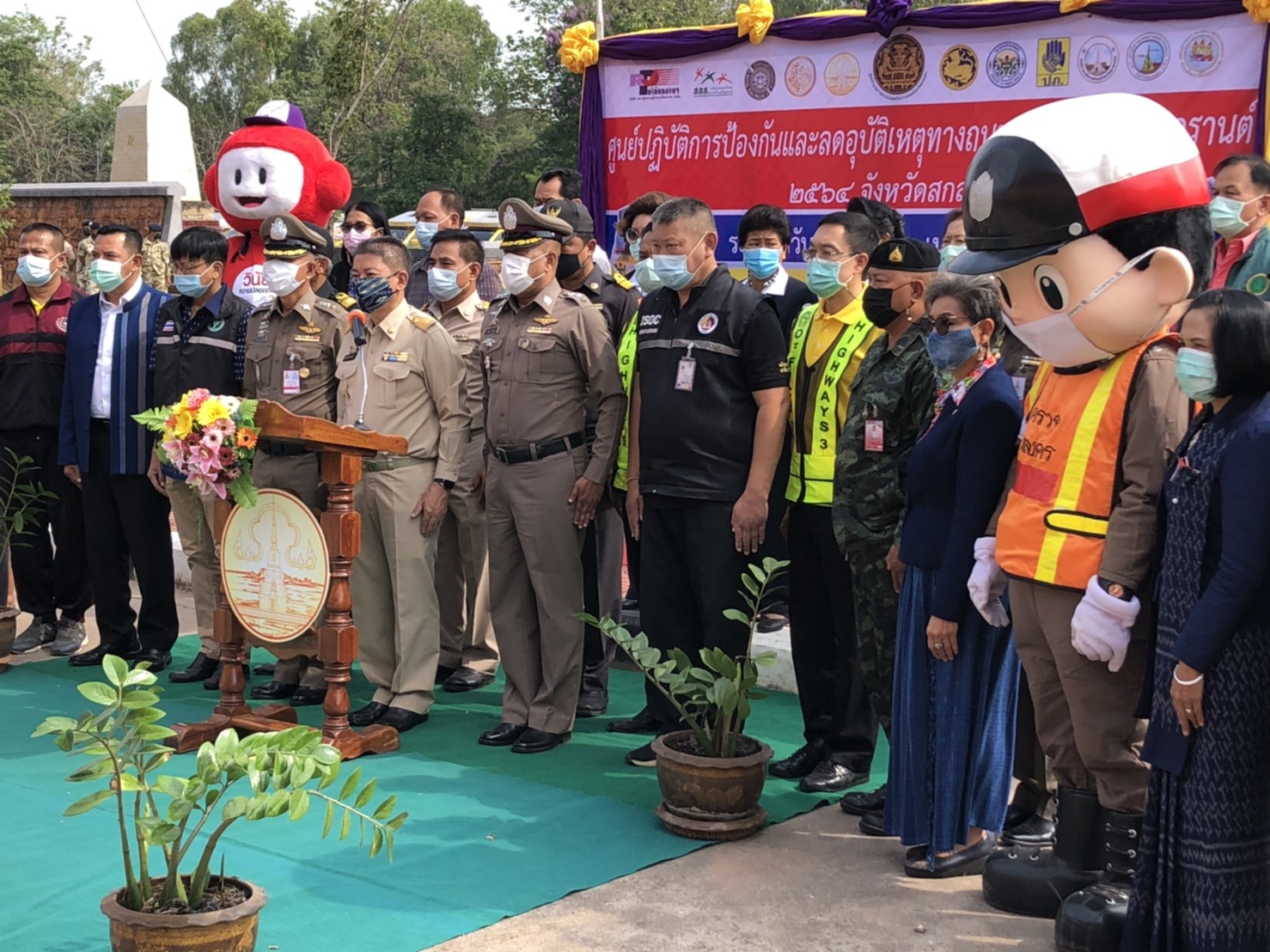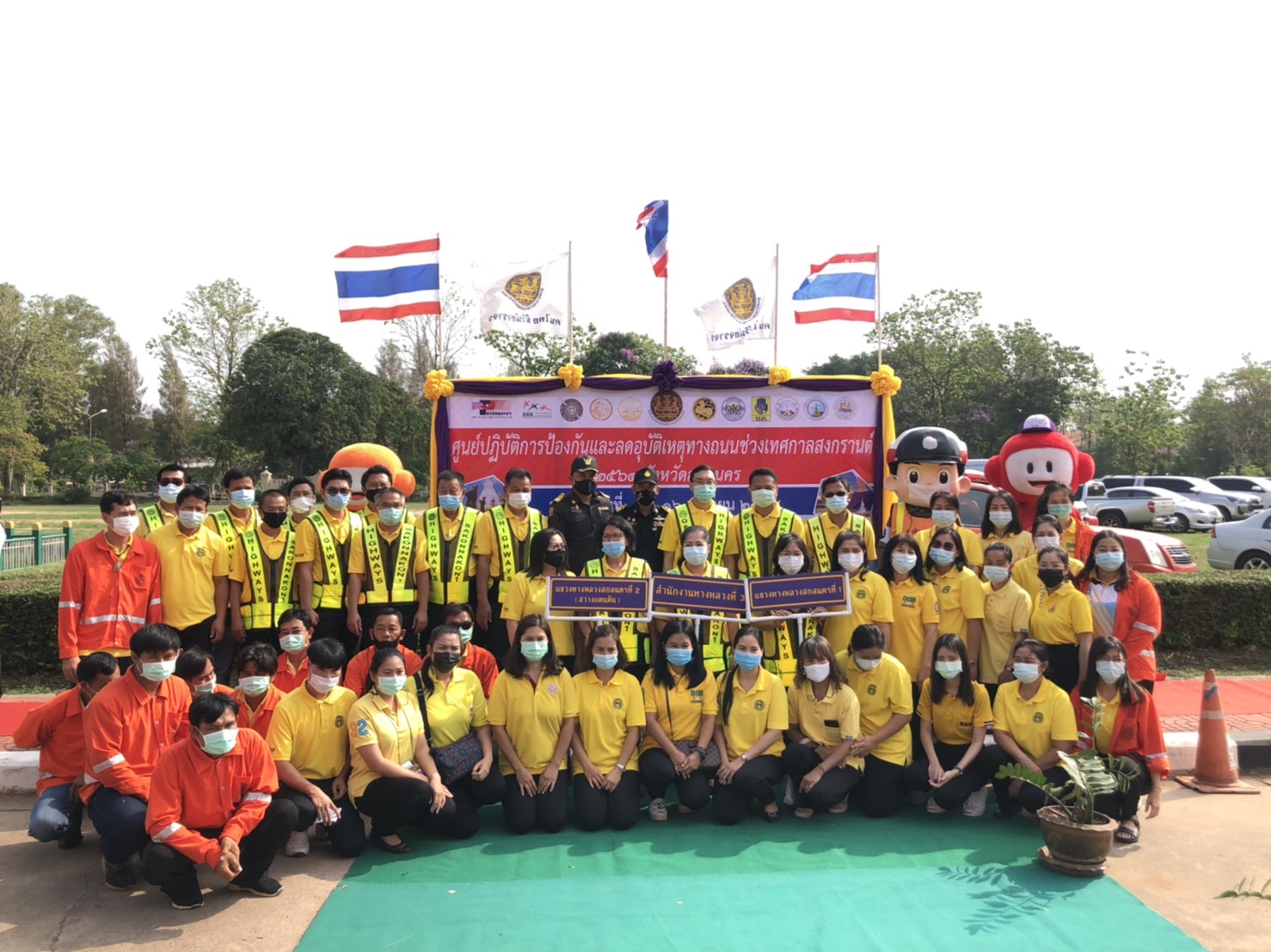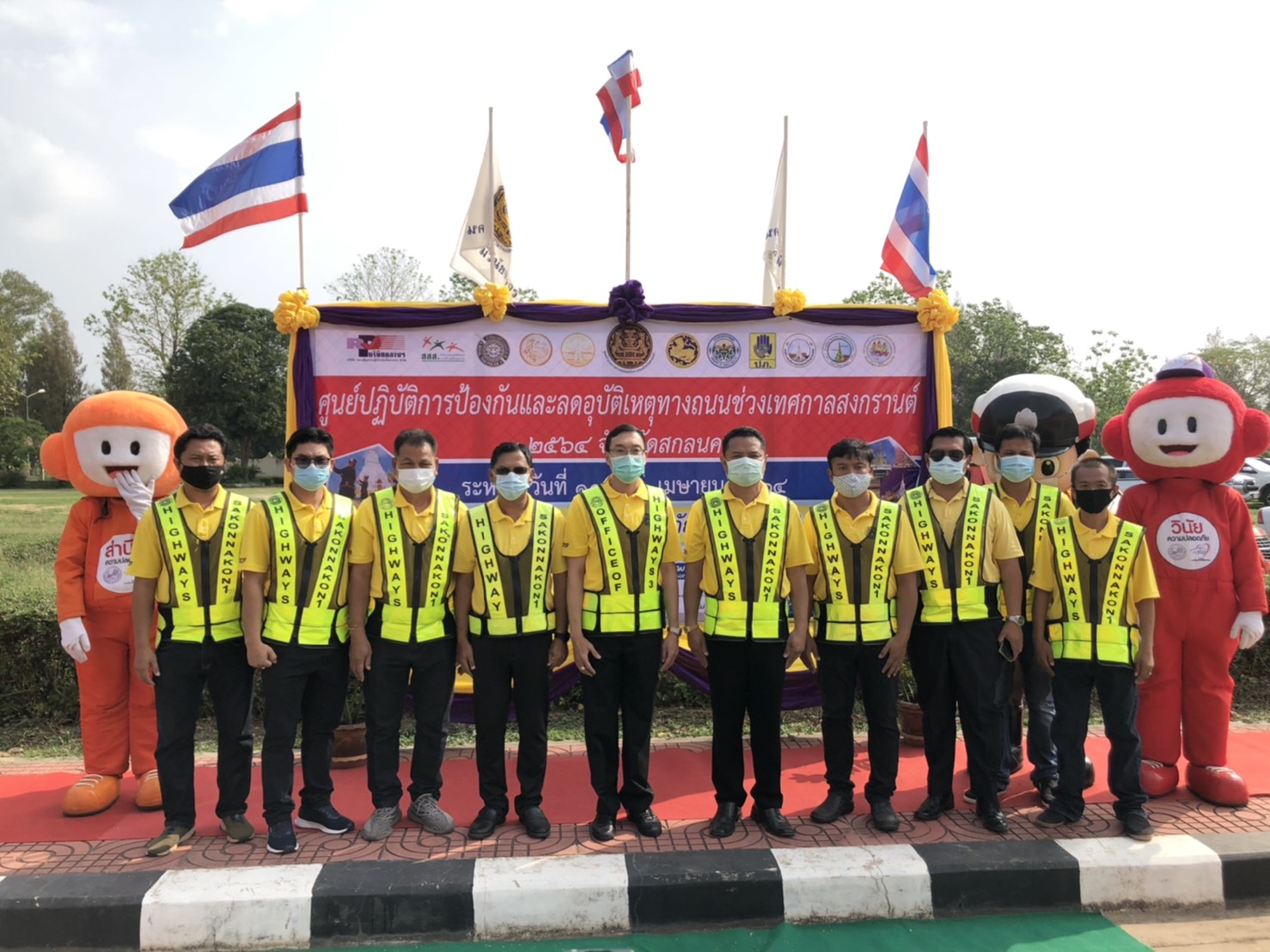 วันที่ 9 เมษายน 2564 เวลา09.00น.หน่วยงานสังกัดกรมทางหลวง กระทรวงคมนาคม ในพื้นที่จังหวัดสกลนคร นำโดยนายพัลลภ จันทร์งามปภากูล ผู้อำนวยการสำนักงานทางหลวงที่ 3 พร้อมด้วยนายประสิทธิ์สาขา ผู้อำนวยการแขวงทางหลวงสกลนครที่1 ,นายสนธยา พลเยี่ยม รองผู้อำนวยการแขวงทางหลวงสกลนครที่1(ฝ่ายวิศวกรรม) ,นายธนพร สีบุญ รองผู้อำนวยการแขวงทางหลวงสกลนครที่1(ฝ่ายปฎิบัติการ) ,นายเฉลิมศักดิ์ ปัญญาประชุม รองผู้อำนวยการแขวงทางหลวงสกลนครที่2(ฝ่ายวิศวกรรม) ,นายภมร ทับทิมทอง รองผู้อำนวยการแขวงทางหลวงสกลนครที่2(ฝ่ายปฎิบัติการ) และหัวหน้าหมวดทางหลวงในสังกัดแขวงทางหลวงสกลนครที่ 1,แขวงทางหลวงสกลนครที่ 2 (สว่างแดนดิน) เข้าร่วมพิธีเปิดศูนย์ปฎิบัติการป้องกันและลดอุบัติเหตุทางถนนช่วงเทศกาลสงกรานต์ 2564 จังหวัดสกลนคร ณ ศาลากลางจังสกลนคร พิธีเปิดศูนย์ปฎิบัติการป้องกันและลดอุบัติเหตุทางถนนช่วงเทศกาลสงกรานต์ 2564 จังหวัดสกลนคร ในครั้งนี้มีนายมนต์สิทธิ์ ไพศาลธนวัฒน์ ผู้ว่าราชการจังหวัดสกลนคร เป็นประธาน
