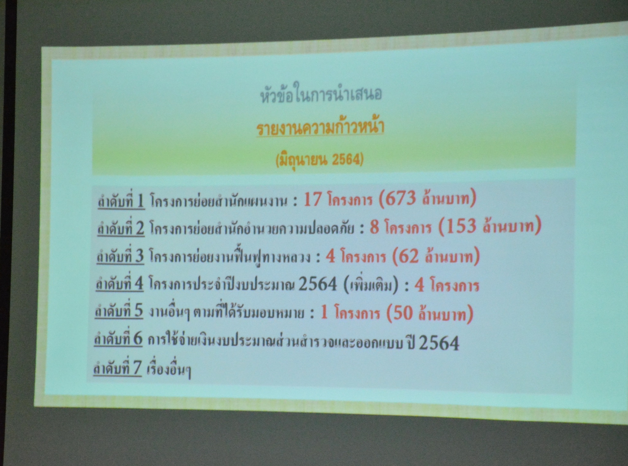 วันที่ 17 มิถุนายน 2564 เวลา 13.30 น. นายพัลลภ จันทร์งามปภากูล ผู้อำนวยการสำนักงานทางหลวงที่3 เป็นประธาน ประชุมเรื่องเพื่อติดตามผลการดำเนินงานด้านต่างๆ ของสำนักงานทางหลวงที่3 (สกลนคร) มีนายประวัติ เสวตวงษ์ รองผู้อำนวยการสำนักงานทางหลวงที่3 ,ผู้อำนวยการส่วน/ฝ่าย/งาน ,เจ้าหน้าที่ส่วนแผนงาน ,เจ้าหน้าที่ส่วนสำรวจและออกแบบ ,เจ้าหน้าที่ส่วนเครื่องกล เข้าร่วมประชุม ณ ห้องสำนักงานทางหลวงที่ 3 (สกลนคร) อาคารหลังใหม่ โดยมีระเบียบวาระประชุม ดังนี้