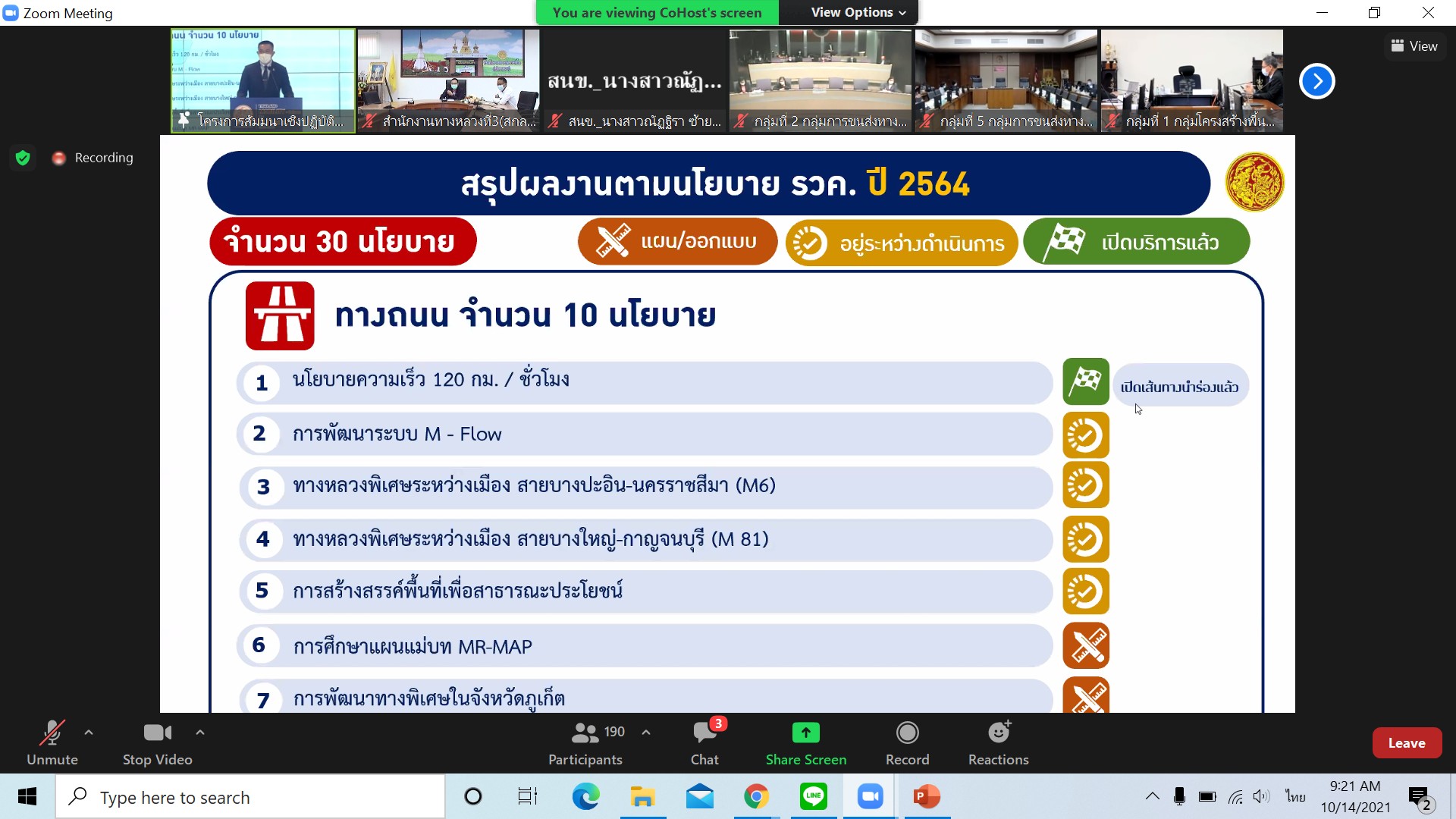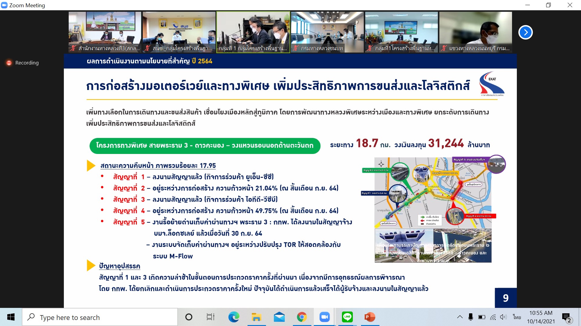 วันที่ 14 – 15 ตุลาคม 2564 ณ ห้องประชุมสำนักงานทางหลวงที่ 3 (สกลนคร) อาคารหลังใหม่ เวลา 09.00 น. นายพัลลภ จันทร์งามปภากูล ผู้อำนวยการสำนักงานทางหลวงที่ 3 พร้อมด้วยนายประวัติ เสวตวงษ์ รองผู้อำนวยการสำนักงานทางหลวงที่ 3 เข้าร่วมโครงการสัมมนาเชิงปฏิบัติการ สรุปผลงานปี 2564 และขับเคลื่อนนโยบายไปสู่การปฏิบัติในปี 2565 (ผู้บริหารระดับต้น ผู้อำนวยการระดับสูง ผู้อำนวยการระดับต้น ของทุกหน่วยงานในสังกัด) โดยผ่านระบบ Zoom Cloud Meeting จากห้องประชุมชั้น 3 อาคารสโมสรและหอประชุมกระทรวมคมนาคม มีนายศักดิ์สยาม ชิดชอบ รัฐมนตรีกระทรวงคมนาคม เป็นประธาน