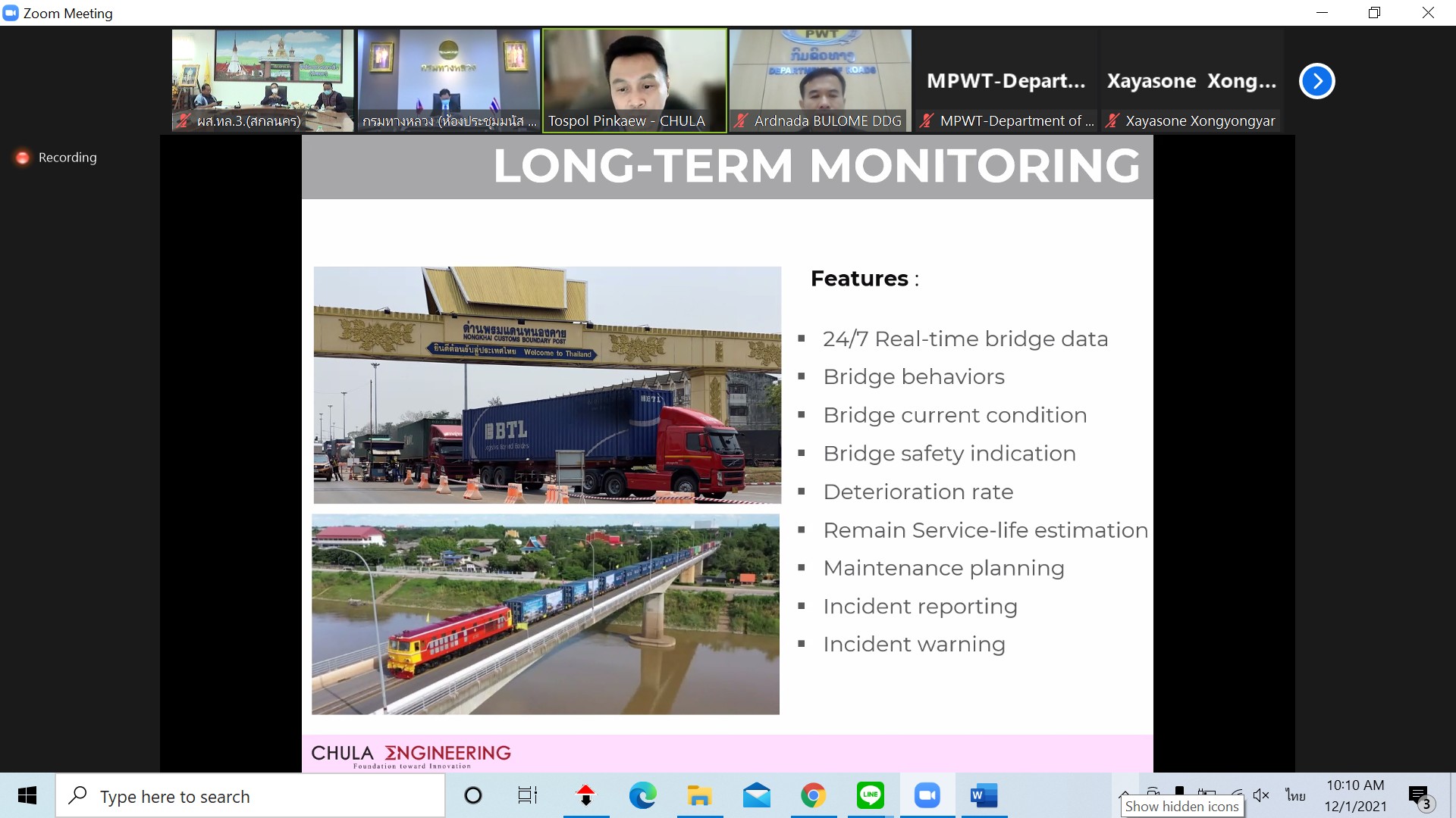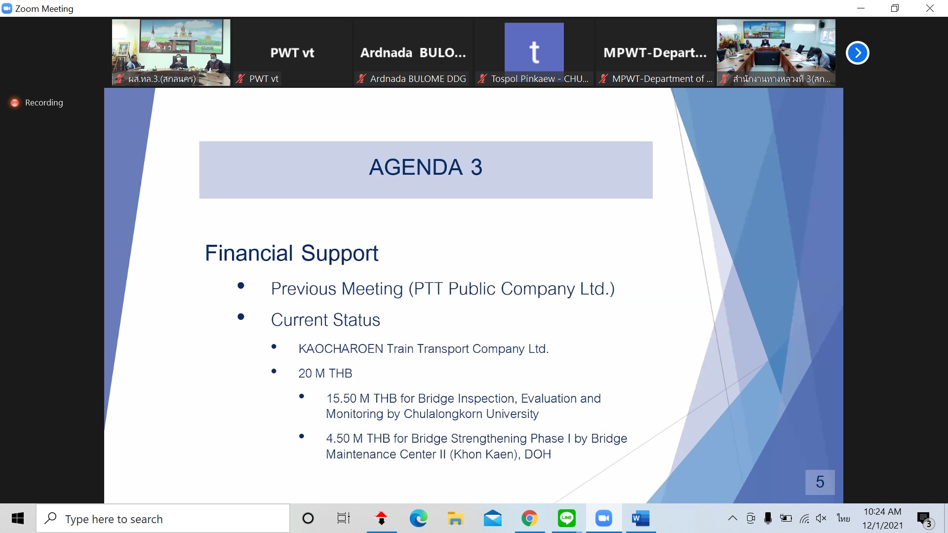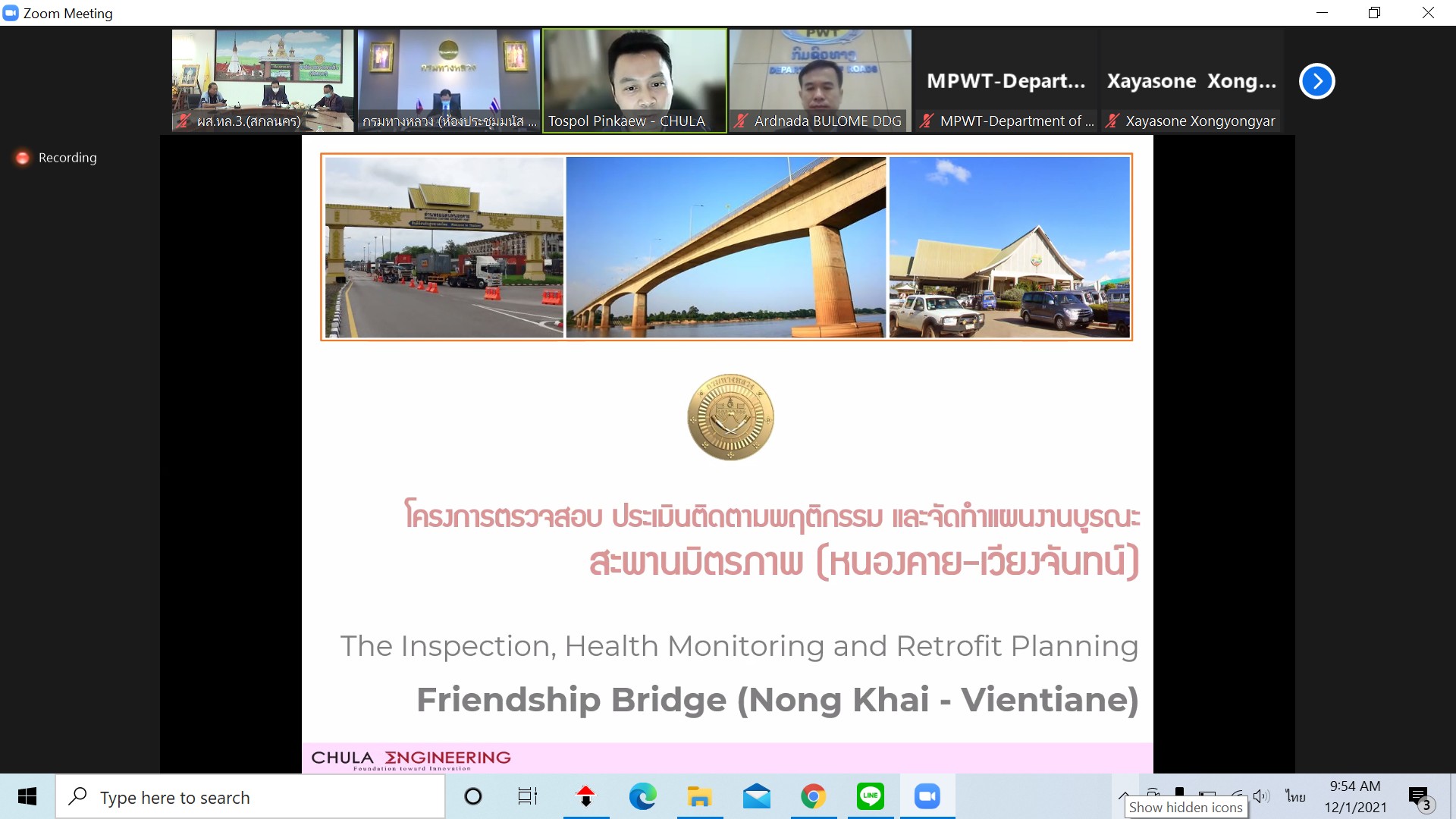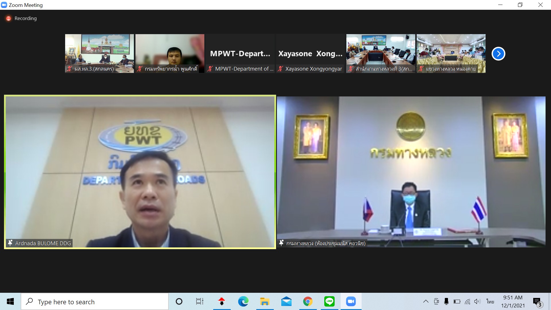 วันที่ 1 ธันวาคม 2564 ณ ห้องประชุมสำนักงานทางหลวงที่ 3 (สกลนคร) อาคารหลังใหม่ เวลา 09.30 น. นายพัลลภ จันทร์งามปภากูล ผู้อำนวยการสำนักงานทางหลวงที่ 3 พร้อมด้วยนายวุฒิพงศ์ คำภูแสน รองผู้อำนวยการสำนักงานทางหลวงที่ 3 ตำแหน่งที่1 นายประวัติ เสวตวงษ์ รองผู้อำนวยการสำนักงานทางหลวงที่ 3 ตำแหน่งที่2 นางนภาพิศ สุวรรณศรี ผู้อำนวยการส่วนบริหารงานทั่วไป และนายธนพนธ์ กิตติธรรม นายช่างโยธาชำนาญงาน เข้าร่วมประชุมคณะกรรมาธิการกำหนดนโยบายบริหารและบำรุงรักษาสะพานมิตรภาพ (หนองคาย-เวียงจันทน์) (ร่วมไทย-ลาว) ครั้งที่ 2 ประจำปีงบประมาณ พ.ศ.2564 โดยผ่านระบบ Zoom Cloud Meeting จากห้องประชุมสวัสดิ์วรวิถี อาคารพหลโยธิน ชั้น 2 กรมทางหลวง เขตราชเทวี มีนายสราวุธ ทรงศิวิไล อธิบดีกรมทางหลวง เป็นประธานร่วมฝั่งไทย