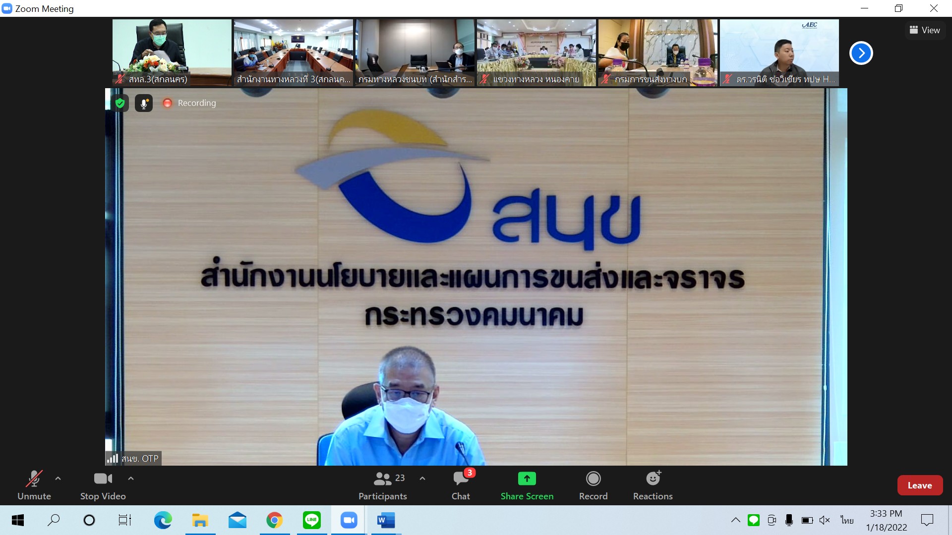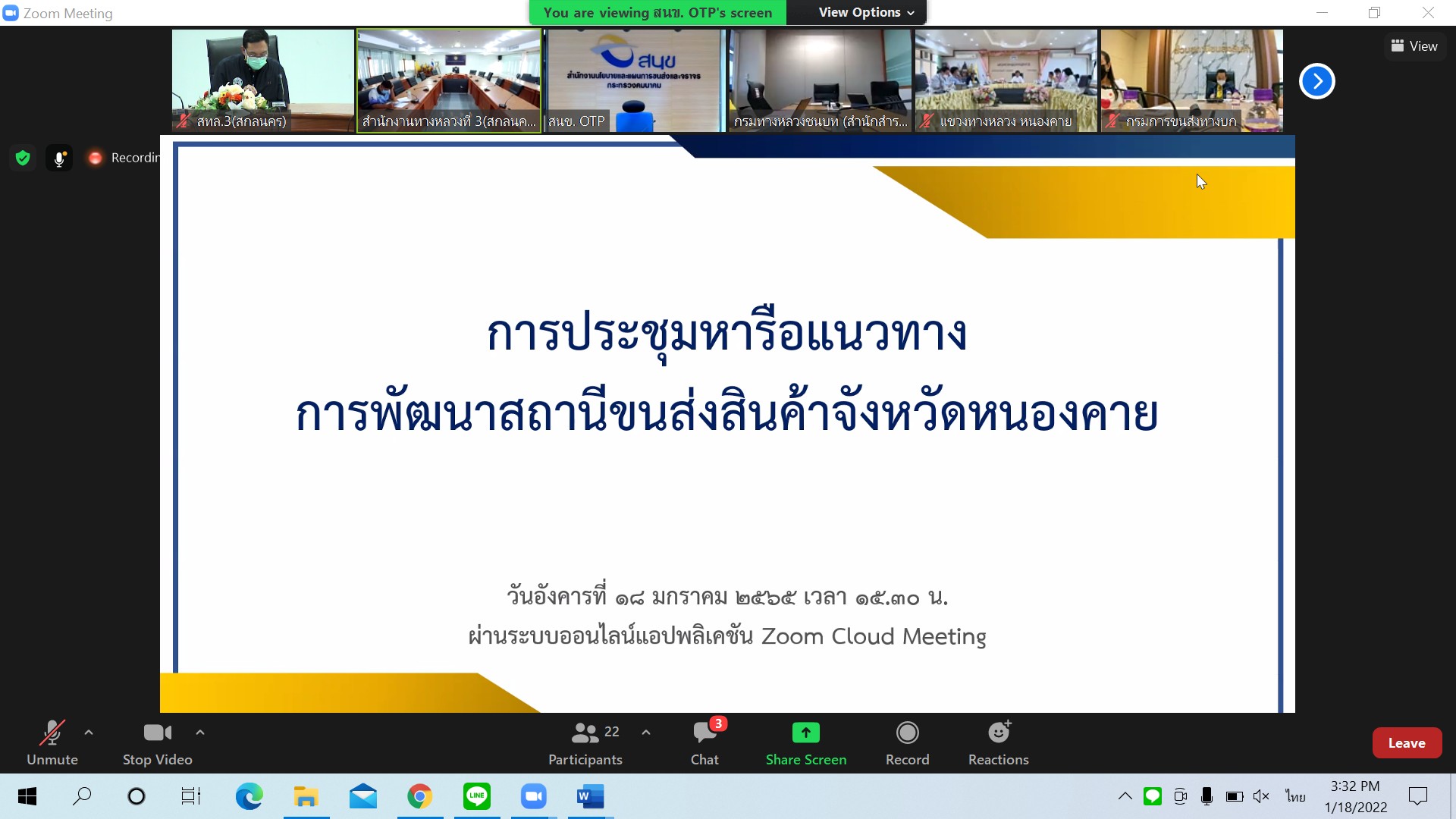 วันที่ 18 มกราคม 2565 ณ ห้องประชุมทวีพัฒน์ ตินะมาส สำนักงานทางหลวงที่ 3 (สกลนคร) เวลา 15.30นายพัลลภ จันทร์งามปภากูล ผู้อำนวยการสำนักงานทางหลวงที่ 3 พร้อมด้วยนายกษิดิศ สินโน วิศวกรโยธาปฎิบัติการ ส่วนสำรวจและออกแบบ เข้าร่วมประชุมหารือแนวทางการพัฒนาสถานีขนส่งสินค้าจังหวัดหนองคายโดยผ่านระบบ Zoom Cloud Meeting