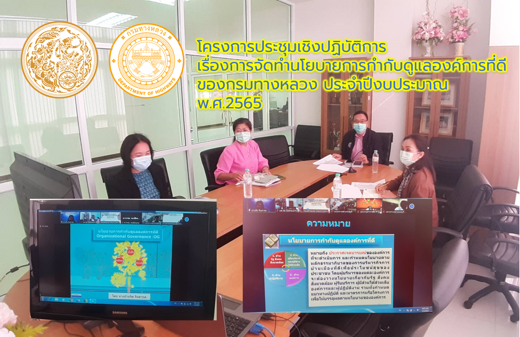 วันที่ 3 กุมภาพันธ์ 2565 ณ ห้องประชุมชั้น 2 สำนักงานทางหลวงที่ 3 (สกลนคร) อาคารหลังใหม่ เวลา 09.00 นายพัลลภ จันทร์งามปภากูล ผู้อำนวยการสำนักงานทางหลวงที่ 3 พร้อมด้วยนางนภาพิศ สุวรรณศรี ผู้อำนวยการส่วนบริหาร นางญาณวรรณ บุษดี นักจัดการงานทั่วไปชำนาญการ และนางมุทิชา นนตะเสน จพ.ธุรการชำนาญงาน ร่วมโครงการประชุมเชิงปฏิบัติการ เรื่องการจัดทำนโยบายการกำกับดูแลองค์กรการที่ดีของกรมทางหลวง ประจำปีงบประมาณ พ.ศ.2565 โดยผ่านระบบ Zoom Cloud Meeting มีวิทยากรจากกองฝึกอบรมกรมทางหลวงบรรยายให้ความรู้แก่ บุคลากร เจ้าหน้าที่ ของสำนักงานทางหลวง แขวงทางหลวง หมวดทางหลวง ในสังกัดกรมทางหลวง ที่เข้าร่วมโครงการฯ