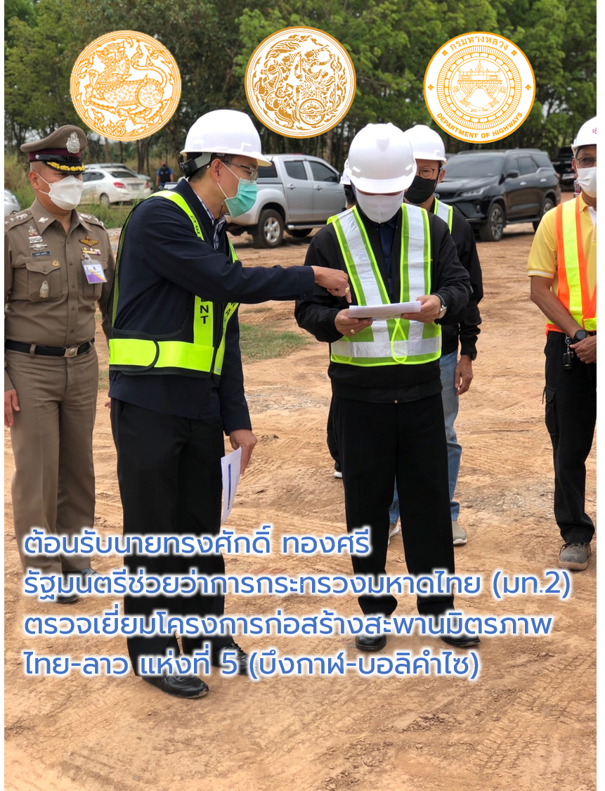 วันที่ 5กุมภาพันธ์ 2565 นายพัลลภ จันทร์งามปภากูล ผู้อำนวยการสำนักงานทางหลวงที่ 3 พร้อมด้วยนายสมจิตร สุภาษิต ผู้อำนวยการแขวงทางหลวง บึงกาฬ และเจ้าหน้าที่โครงการก่อสร้างสะพานมิตรภาพไทย-ลาว แห่งที่ 5 (บึงกาฬ-บอลิคำไซ) ร่วมต้อนรับนายทรงศักดิ์ ทองศรี รัฐมนตรีช่วยว่าการกระทรวงมหาดไทย (มท.2) เนื่องในโอกาสลงพื้นที่ตรวจเยี่ยมและติดตามความก้าวหน้าของโครงการก่อสร้างสะพานมิตรภาพไทย-ลาว แห่งที่ 5 (บึงกาฬ-บอลิคำไซ)