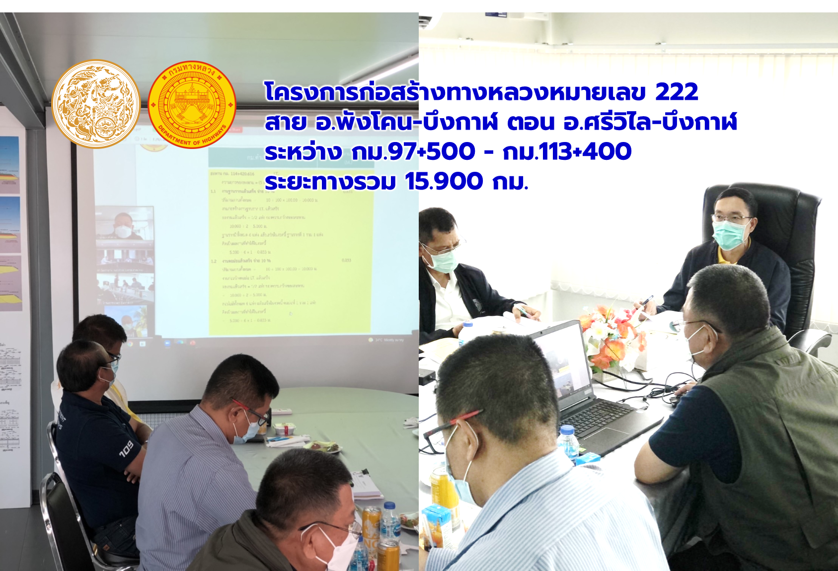 วันที่ 8 กุมภาพันธ์ 2565 เวลา15.00 นายพัลลภ จันทร์งามปภากูล ผู้อำนวยการสำนักงานทางหลวงที่ 3 กรรมการตรวจรับพัสดุ พร้อมด้วยนายสมจิตร สุภาษิต ผู้อำนวยการแขวงทางหลวงบึงกาฬกรรมการตรวจรับพัสดุ และคณะกรรมการตรวจรับพัสดุ ลงพื้นที่ดูงานโครงการก่อสร้างทางหลวงหมายเลข 222 สาย อ.พังโคน-บึงกาฬ ตอน อ.ศรีวิไล-บึงกาฬ ระหว่าง กม.97+500 - กม.113+400 ระยะทางรวม 15.900 กม. วงเงินงบประมาณ 544,265,000 บาท (ตรวจรับงานงวดที่ 12) โดยมีมีบริษัท ถนอมวงศ์บริการ จำกัด เป็นผู้รับจ้าง เพื่อให้การดำเนินงานก่อสร้างทางหลวงแผ่นดินได้ตามแบบมาตรฐานของกรมทางหลวง กระทรวงคมนาคม พร้อมรับฟังบรรยายสรุปผลการดำเนินงานของโครงการฯ ณ ห้องประชุมสำนักงานชั่วคราวของโครงการฯ ควบคุมการก่อสร้างโดยสำนักก่อสร้างทางที่ 2 กรมทางหลวง ส่วนนายสิทธิชัย บุญสะอาด วิศวกรใหญ่ด้านสำรวจและออกแบบ ปฏิบัติราชการแทนวิศวกรใหญ่ด้านอำนวยความปลอดภัย ประธานกรรมการตรวจรับพัสดุ ร่วมตรวจรับงานงวดนี้ผ่านระบบ Zoom Cloud Meeting