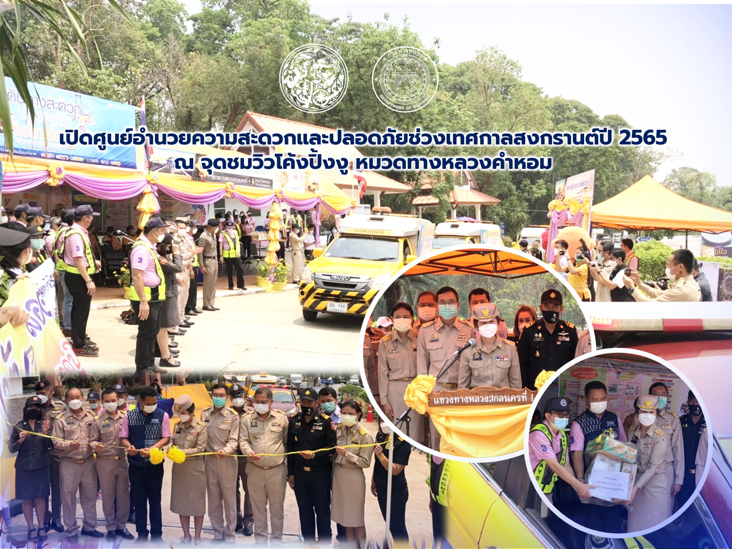 วันที่11 เมษายน 2565 เวลา 11.11น.นายพัลลภ จันทร์งามปภากูล ผู้อำนวยการสำนักงานทางหลวงที่ 3 พร้อมด้วยนายประสิทธิ์ สาขา ผู้อำนวยการแขวงทางหลวงสกลนครที่1 นายสนธยา พลเยี่ยม รองผู้อำนวยการฝ่ายวิศวกรรม นายธนพร สีบุญ รองผู้อำนวยการฝ่ายปฎิบัติการ เเละหัวหน้าหมวดทางหลวงในสังกัดแขวงทางหลวงสกลนครที่1 ร่วมพิธีเปิดศูนย์อำนวยความสะดวกและปลอดภัยช่วงเทศกาลสงกรานต์ปี 2565 โดยมีนางจุรีรัตน์ เทพอาสน์ ผู้ว่าราชการจังหวัดสกลนคร เป็นประธาน ศูนย์อำนวยความสะดวกและปลอดภัยช่วงเทศกาลสงกรานต์ปี 2565 เริ่มตั้งแต่วันที่11-18 เมษายน 2565 การเปิดศูนย์ฯ ในครั้งนี้มีหน่วยงานสังกัดกระทรวงคมนาคมในพื้นที่จังหวัดสกลนครร่วมพิธี ณ จุดชมวิวโค้งปิ้งงู หมวดทางหลวงคำหอม แขวงทางหลวงสกลนครที่ 1 จังหวัดสกลนคร