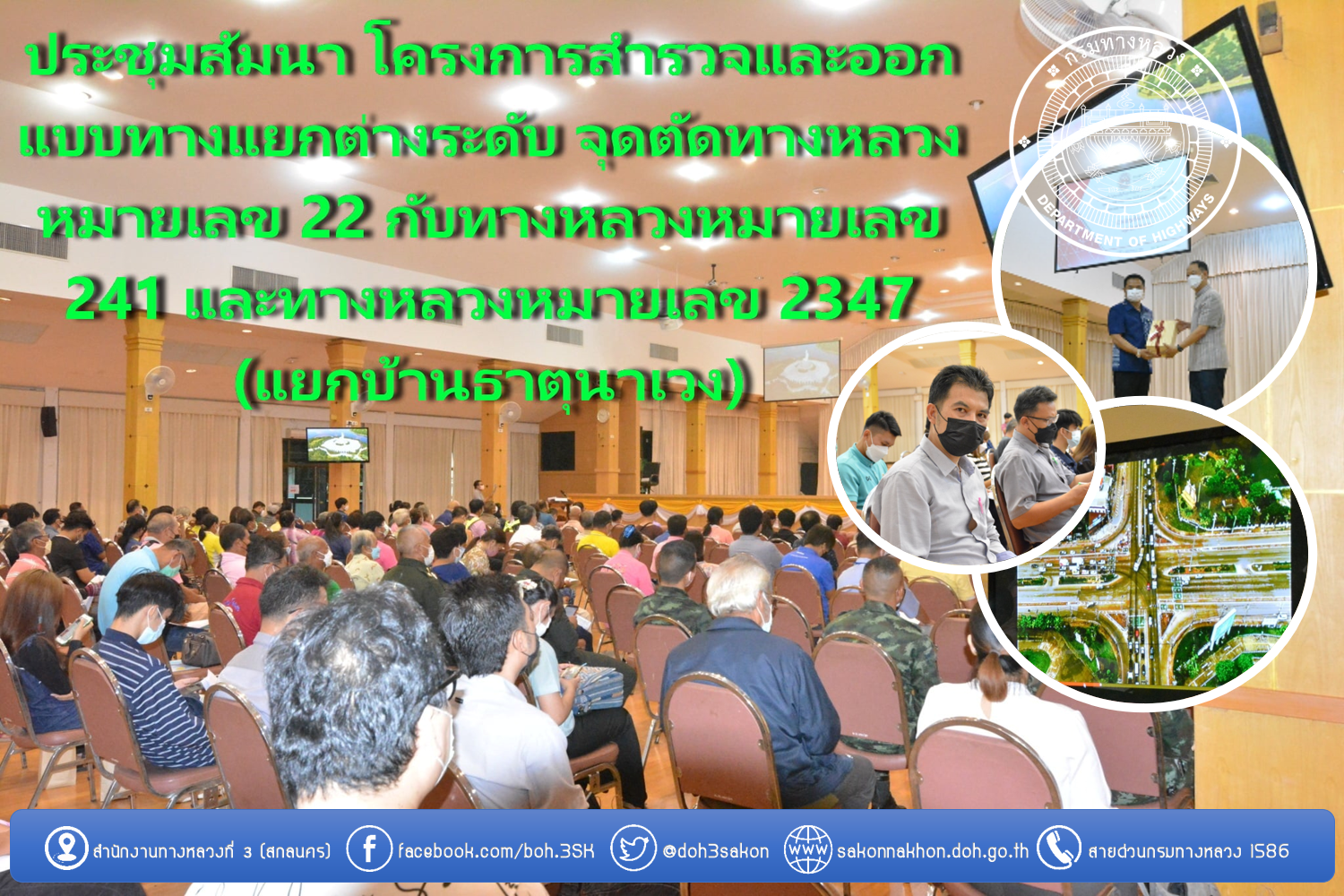 นที่ 26 เมษายน 2565 เวลา 09.30 น. นายพัลลภ จันทร์งามปภากูล ผู้อำนวยการสำนักงานทางหลวงที่ 3 มอบหมายให้ นายอำนาจ สาไชยันต์ ผู้อำนวยการส่วนเทคโนโลยีสารสนเทศ เข้าร่วมปฐมนิเทศโครงการสำรวจเเละออกเเบบทางเเยกต่างระดับ จุดตัดทางหลวงหมายเลข 22 กับทางหลวงหมายเลข 241 เเละทางหลวงหมายเลข 2347 (เเยกบ้านธาตุนาเวง) ดำเนินการโดย บริษัท วิศวกร 31 จำกัด ร่วมกับ บริษัท สิ่งเเวดล้อมสยาม จำกัด พร้อม ด้วยเเขกผู้มีเกียรติ ประชาชนในพื้นที่ หน่วยงานในพื่นที่ที่เกี่ยวข้อง การประชุมนี้จัดขึ้น ณ หอประชุมจามจุรีมหาวิทยาลัยราชภัฏสกลนคร โดยมี นายจำรัส นาเเฉล้ม รองผู้ราชการจังหวัดสกลนคร เป็นประธาน