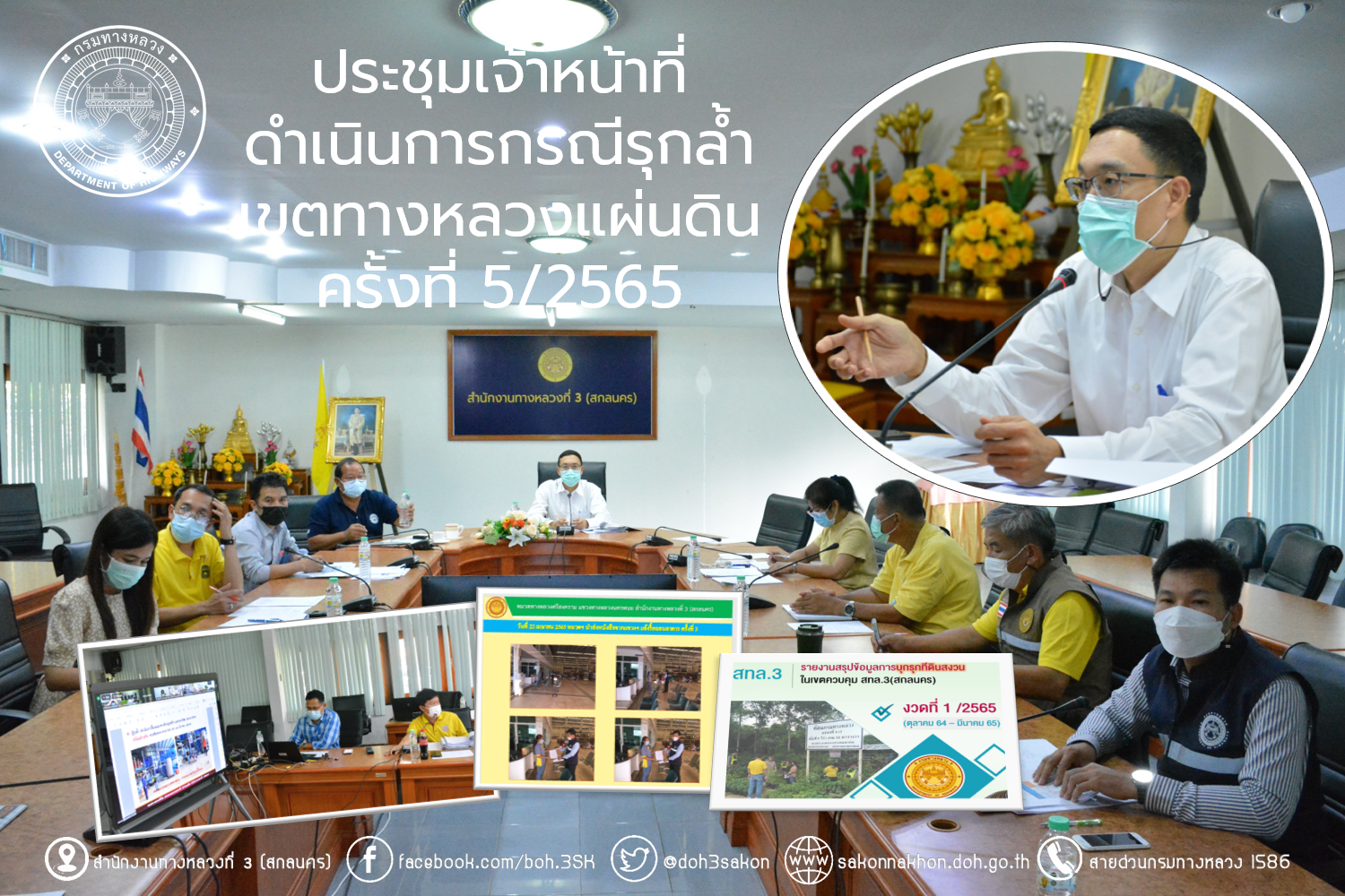 วันที่ 26 เมษายน 2565 เวลา 13.30น. ณ ห้องประชุมทวีพัฒน์ ตินะมาส นายพัลลภ จันทร์งามปภากูล ผู้อำนวยการสำนักงานทางหลวงที่ 3 เป็นประธาน ประชุมเจ้าหน้าที่ดำเนินการกรณีรุกล้ำเขตทางหลวงแผ่นดิน ครั้งที่ 5/2565 ของทางหลวงหมายเลข 22 สายอุดรธานี – สกลนครในพื้นที่แขวงทางหลวงสกลนครที่ 2(สว่างแดนดิน) และทางหลวงหมายเลข 2346 ตอน นาหว้า-ดงขวาง กม.26+244 – กม.26+275 ในพื้นที่แขวงทางหลวงนครพนม มีนายวุฒิพงศ์ คำภูแสน รองผู้อำนวยการสำนักงานทางหลวงที่ 3 นายภมร ทับทิมทอง รองผู้อำนวยการแขวงทางหลวงสกลนครที่ 2 (สว่างแดนดิน) ว่าที่ร้อยตรียอดเพ็ชร คำแสงดี รองผู้อำนวยการแขวงทางหลวงนครพนม นางนภาพิศ สุวรรณศรี ผู้อำนวยการส่วนบริหาร นายอำนาจ สาไชยันต์ ผู้อำนวยการส่วนเทคโนโลยีสารสนเทศ นายวีรวัฒน์ บุ่งนาแซง นิติกรปฎิบัติการ นายศิริวัฒน์ โอฆะพรม หัวหน้าหมวดทางหลวงศรีสงคราม และนายศิลวัต หินสอ ผู้ช่วยหมวดทางหลวงพังโคน ร่วมประชุม และในการประชุมครั้งนี้มีเจ้าหน้าที่แขวงทางหลวงในสังกัด ที่เกี่ยวข้องร่วมประชุมโดยผ่านระบบ Zoom Cloud Meeting ของสำนักงานทางหลวงที่ 3 (สกลนคร)
