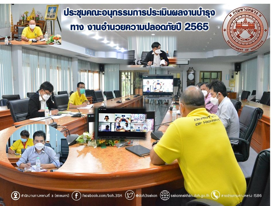 วันที่ 10 พฤษภาคม 2565 เวลา 10.00 น. ณ ห้องประชุมทวีพัฒน์ ตินะมาส นายวุฒิพงศ์ คำภูแสน รองผู้อำนวยการสำนักงานทางหลวงที่ 3 เป็นประธาน ประชุมคณะอนุกรรมการประเมินผลงานบำรุงทาง งานอำนวยความปลอดภัยปี 2565 กลุ่มที่ 2 ภาคตะวันออกเฉียงเหนือ ครั้งที่ 3/2565 มีนายสนธยา พลเยี่ยม รองผู้อำนวยการแขวงทางหลวงสกลนครที่1 นายพงษ์ศักดิ์ อาจลา ผู้อำนวยการส่วนสำรวจและออกแบบ นายพงษ์ศักดิ์ สารพรหม นายช่างอาวุโส ส่วนตรวจสอบและวิเคราะห์ทางวิศวกรรม นายอำนาจ สาไชยันต์ ผู้อำนวยการส่วนเทคโนโลยีสารสนเทศ นายธนากรณ์ ติยะบุตร วิศวกรโยธาปฏิบัติการ ส่วนแผนงาน ผู้อำนวยการแขวงในสังกัดเข้าร่วมประชุมโดยผ่านระบบ Zoom Cloud Meeting