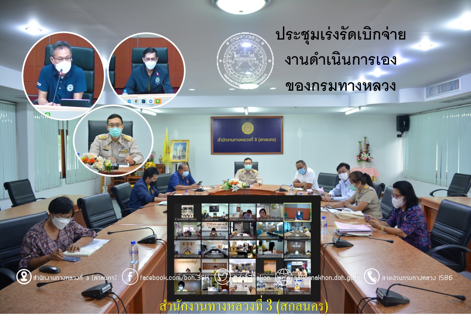 วันที่ 23 พฤษภาคม 2565 เวลา 10.30 น. ณ ห้องประชุมทวีพัฒน์ ตินะมาส นายพัลลภ จันทร์งามปภากูล ผู้อำนวยการสำนักงานทางหลวงที่ 3 พร้อมด้วยนายวุฒิพงศ์ คำภูแสน รองผู้อำนวยการสำนักงานทางหลวงที่ 3 ตำแหน่งที 1 นายประวัติ เสวตวงษ์ รองผู้อำนวยการสำนักงานทางหลวงที่ 3 ตำแหน่งที่ 2 นายเกรียงศักดิ์ ตันปิยะกุล ผู้อำนวยการแขวงทางหลวงมุกดาหาร นางนภาพิศ สุวรรณศรี ผู้อำนวยการส่วนบริหาร นายอำนาจ สาไชยันต์ ผู้อำนวยการส่วนเทคโนโลยีสารสนเทศ นางสำนวน ทำเนาว์ หัวหน้างานพัสดุและสัญญา และนางรุ่งดาว ชมพูวิเศษ หัวงานการเงินและบัญชี ร่วมประชุมเร่งรัดเบิกจ่ายงานดำเนินการเอง โดยผ่านระบบ Zoom Cloud Meeting จากห้องประชุมสวัสดิ์วรวิถี กรมทางหลวง โดยมีนายมนตรี เดชาสกุลสม รองอธิบดีกรมทางหลวงฝ่ายวิชาการ และนายไพฑูรย์ พงษ์ชวลิต รองอธิบดีกรมทางหลวงฝ่ายบริหาร เป็นประธาน ในการประชุมครั้งนี้มีหน่วยงานในสังกัดกรมทางหลวง ทั้ง 18 สำนักงานทางหลวง และศูนย์สร้างทางและสะพาน เข้าร่วมประชุม