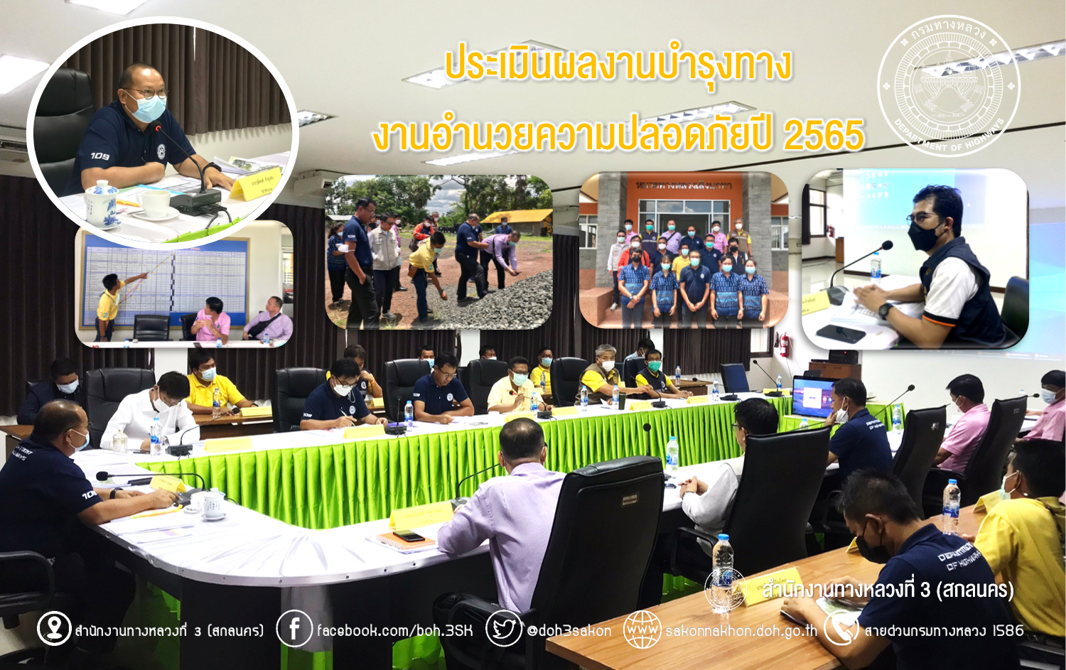 วันที่ 24 พฤษภาคม 2565 สำนักงานทางหลวงที่3 (สกลนคร) นายวุฒิพงศ์ คำภูแสน รองผู้อำนวยการสำนักงานทางหลวงที่ 3 ประธานกรรมการประเมินฯ นำคณะกรรมการประเมินผลงานบำรุงทาง งานอำนวยความปลอดภัยปี 2565 กลุ่มที่ 2 ภาคตะวันออกเฉียงเหนือ ออกประเมินผลงานบำรุงทาง งานอำนวยความปลอดภัยปี 2565 ของแขวงทางหลวง หมวดทางหลวงในสังกัด ระหว่างวันที่ 24-27พฤษภาคม 2565 และวันที่ 31พฤษภาคม-1 มิถุนายน 2565 เพื่อคัดเลือก ผู้อำนวยการแขวงทางหลวง หัวหน้าหมวดทางหลวง และหัวหน้างานฝ่ายวิศวกรรม ดีเด่นประจำปี 2565