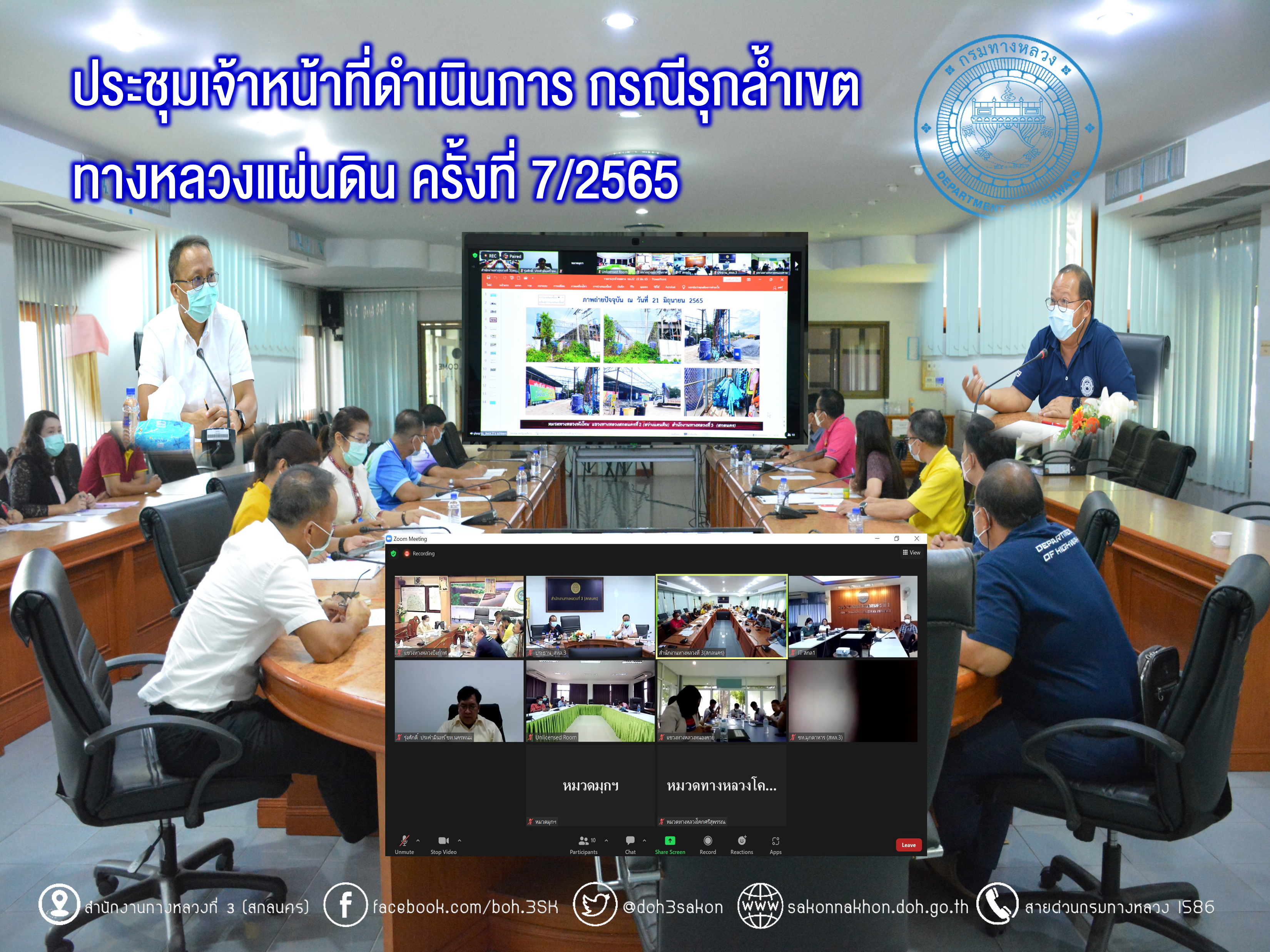 วันที่ 22 มิถุนายน 2565 เวลา 13.30น. วุฒิพงศ์ คำภูแสน รองผู้อำนวยการสำนักงานทางหลวงที่ 3 ตำแหน่งที่ 1 เป็นประธาน ประชุมเจ้าหน้าที่ดำเนินการกรณีรุกล้ำเขตทางหลวงแผ่นดิน ครั้งที่ 7/2565 ของแขวงทางหลวงในสังกัด กรณีรุกล้ำเขตทางหลวงหมายเลข 22 สายอุดรธานี – สกลนคร และทางหลวงหมายเลข 2346 ตอน นาหว้า-ดงขวาง มีนายประวัติ เสวตวงษ์ รองผู้อำนวยการสำนักงานทางหลวงที่ 3 ตำแหน่งที่ 2 นายภมร ทับทิมทอง รองผู้อำนวยการแขวงทางหลวงสกลนครที่ 2 ฝ่ายปฎิบัติการ นางไพรพรรณ เทืองกอง รองผู้อำนวยการแขวงทางหลวงสกลนครที่ 2 ฝ่ายบริหาร ว่าที่ร้อยตรียอดเพ็ชร คำแสงดี รองผู้อำนวยการแขวงทางหลวงนครพนม นางนภาพิศ สุวรรณศรี ผู้อำนวยการส่วนบริหาร นายอำนาจ สาไชยันต์ ผู้อำนวยการส่วนเทคโนโลยีสารสนเทศ นายวีรวัฒน์ บุ่งนาแซง นิติกรปฎิบัติการ นายศิริวัฒน์ โอฆะพรม หัวหน้าหมวดทางหลวงศรีสงคราม และนายศิลวัต หินสอ ผู้ช่วยหมวดทางหลวงพังโคน ร่วมประชุม ณ ห้องประชุมทวีพัฒน์ ตินะมาส ในการประชุมครั้งนี้มีเจ้าหน้าที่แขวงทางหลวง หัวหน้าหมวดทางหลวงในสังกัด ที่เกี่ยวข้องร่วมประชุมผ่านระบบ Zoom Cloud Meeting ของสำนักงานทางหลวงที่ 3 (สกลนคร)