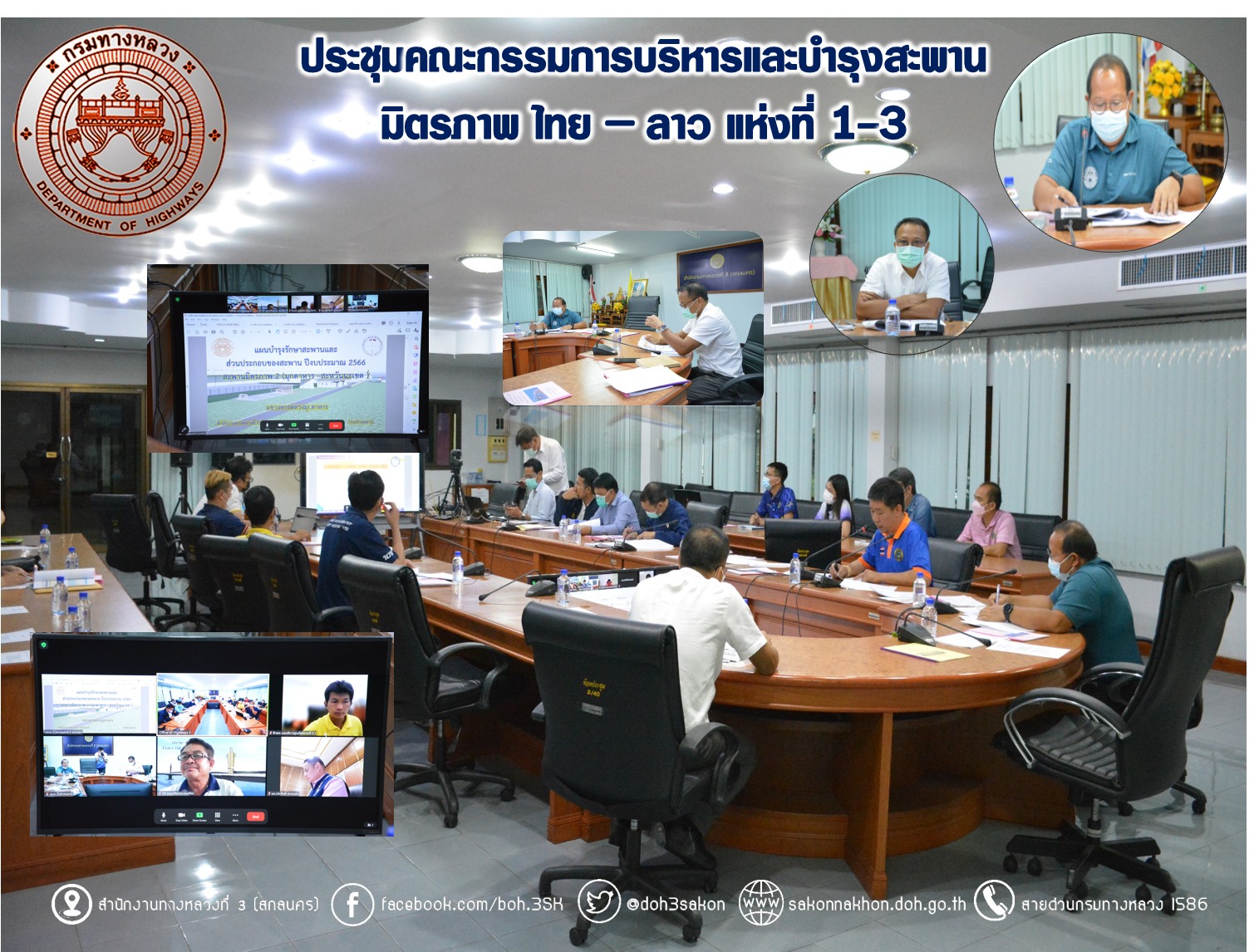 วันที่ 7 กรกฎาคม 2565 เวลา 13.30 น. นายวุฒิพงศ์ คำภูแสน รองผู้อำนวยการสำนักงานทางหลวงที่ 3 ตำแหน่งที่1 และ นายประวัติ เสวตวงษ์ รองผู้อำนวยการสำนักงานทางหลวงที่ 3 ตำแหน่งที่2 เป็นประธาน ประชุมคณะกรรมการบริหารและบำรุงสะพานมิตรภาพ ไทย - ลาว แห่งที่ 1-3 เพื่อพิจารณาแผนรายประมาณการงานบริหาร - อำนวยการ (งบบำรุงปกติ) และงานบำรุงพิเศษประจำปีงบประมาณ พ.ศ.2566 มีผู้อำนวยการส่วนบริหาร ผู้อำนวยการส่วนกฎหมายและกรรมสิทธิ์ที่ดิน นิติกร ผู้อำนวยการแขวงทางหลวงหนองคาย ผู้จัดการด่านสะพานมิตรภาพแห่งที่ 1- 3 หมวดทางหลวงหนองคาย วิศวกรโยธา นายช่างโยธา ส่วนแผนงาน ร่วมประชุม