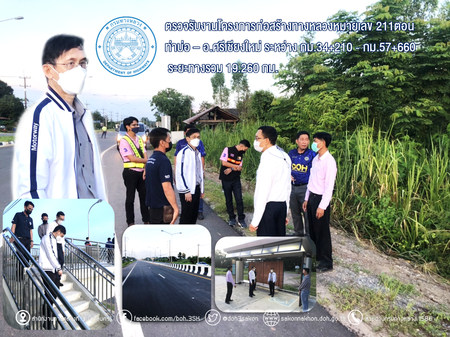 วันที่ 27 กรกฎาคม 2565 เวลา 09.00 น. นายไพฑูรย์ พงษ์ชวลิต รองอธิบดีกรมทางหลวง ฝ่ายบริหาร รักษาราชการแทนรองอธิบดีกรมทางหลวง ฝ่ายบำรุงทาง ประธานกรรมการตรวจรับพัสดุ พร้อมด้วยนายพัลลภ จันทร์งามปภากูล ผู้อำนวยการสำนักงานทางหลวงที่ 3 กรรมการตรวจรับพัสดุ และคณะกรรมการตรวจรับพัสดุ ลงพื้นที่ตรวจรับงานโครงการก่อสร้างทางหลวงหมายเลข 211ตอน ท่าบ่อ – อ.ศรีเชียงใหม่ ระหว่าง กม.34+210 - กม.57+660 ระยะทางรวม 19.260 กม. วงเงินงบประมาณ 648,041,800 บาท (งวดสุดท้าย) เพื่อให้การดำเนินงานก่อสร้างทางหลวงแผ่นดินได้ตามแบบมาตรฐานของกรมทางหลวง กระทรวงคมนาคม โดยมีห้างหุ้นส่วนจำกัด กิจรุ่งเรืองก่อสร้าง เป็นผู้รับจ้าง พร้อมรับฟังบรรยายสรุปผลการดำเนินงานของโครงการฯ ณ ห้องประชุมแขวงทางหลวงหนองคาย