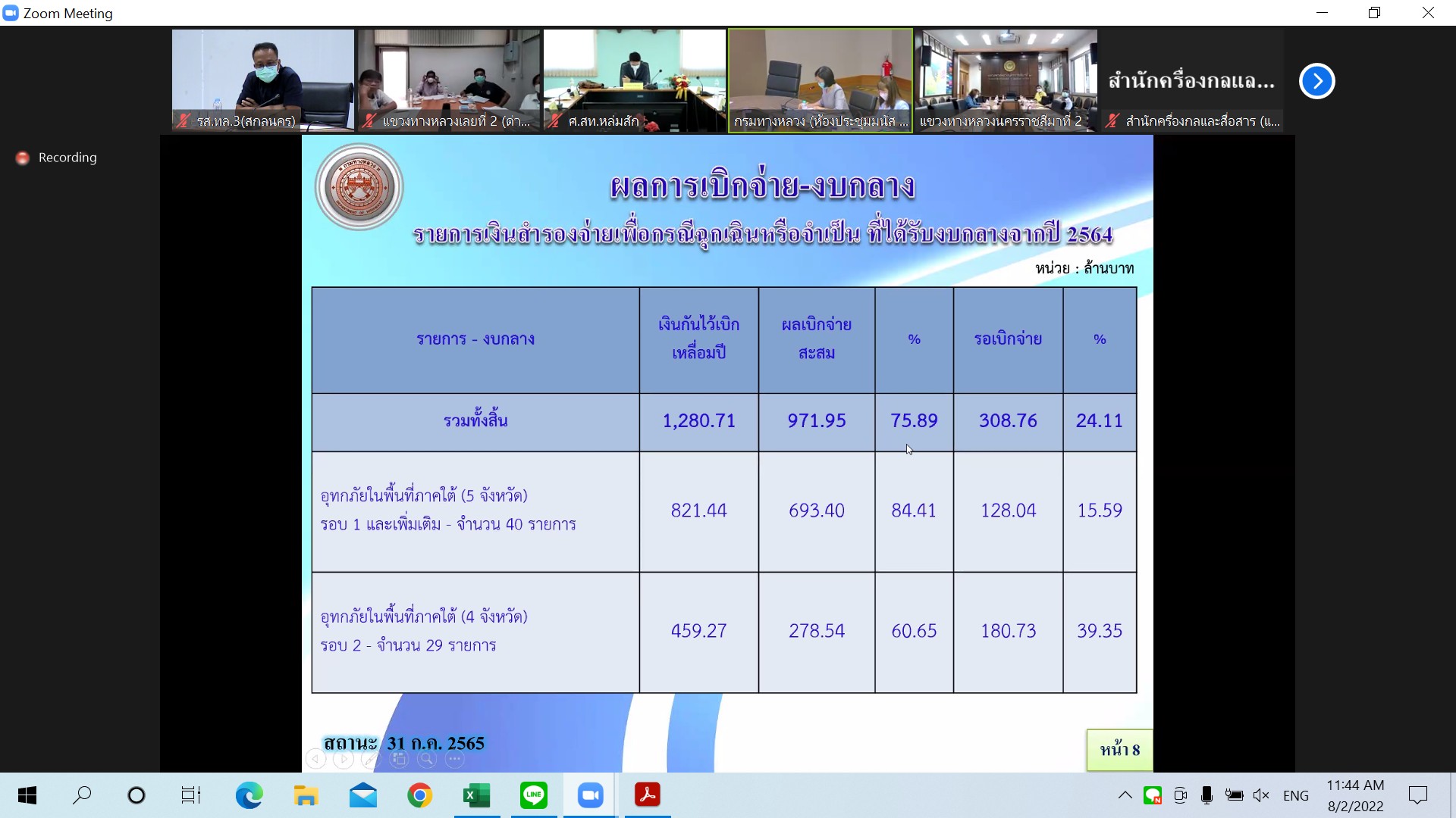 วันที่ 2 สิงหาคม 2565 เวลา 11.00 นายสราวุธ ทรงศิวิไล อธิบดีกรมทางหลวงเป็นประธาน ประชุมเร่งรัดติดตามผลการดำเนินงานและการเบิกจ่ายเงินงบประมาณประจำปี พ.ศ.2565 ครั้งที่ 4/2565 ของกรมทางหลวง โดยผ่านระบบ Zoom Cloud Meeting จากห้องประชุมมนัส คอวนิช กรมทางหลวง สำนักงานทางหลวงที่ 3 (สกลนคร) โดยนายประวัติ เสวตวงษ์ รองผู้อำนวยการสำนักงานทางหลวงที่ 3 พร้อมด้วยนายพงษ์ศักดิ์ อาจลา ผู้อำนวยการส่วนสำรวจและออกแบบ นางรุ่งดาว ชมพูวิเศษ หัวหน้างานการเงิน และวิศวกรโยธา นายช่างโยธาส่วนแผนงาน เข้าร่วมประชุมผ่านระบบ Zoom Cloud Meeting ณ ห้องประชุมทวีพัฒน์ ตินะมาส ในการประชุมครั้งนี้มีหน่วยงานสังกัดกรมทางหลวง ทั้ง 18 สำนักงานทางหลวง เข้าร่วมประชุมด้วย