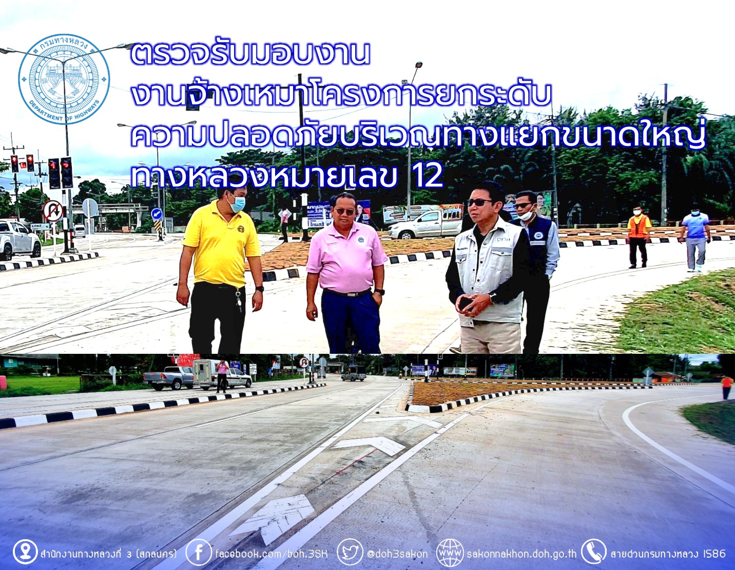 วันที่ 16 สิงหาคม 2565 เวลา 10.00 น. นายวุฒิพงศ์ คำภูแสน รองผู้อำนวยการสำนักงานทางหลวงที่ 3 ประธานกรรมการตรวจรับพัสดุ พร้อมด้วยคณะกรรมการตรวจรับพัสดุ ลงพื้นที่ตรวจรับงานของโครงการก่อสร้างทางหลวงปี 2565 สัญญาเลขที่ มห.6/2565 งานจ้างเหมาโครงการยกระดับความปลอดภัยบริเวณทางแยกขนาดใหญ่ ทางหลวงหมายเลข 12 ตอน ตอน คำพอก - มุกดาหาร (งวดสุดท้าย) มีห้างหุ้นส่วนจำกัด ชัยมงคลมุกดาหาร เป็นผู้รับจ้างเพื่อให้การดำเนินงานก่อสร้างทางหลวงแผ่นดินได้ตามแบบมาตรฐานของกรมทางหลวง กระทรวงคมนาคม ควบคุมงานก่อสร้างโดยส่วนควบคุมงานก่อสร้าง สำนักงานทางหลวงที่ 3 (สกลนคร)