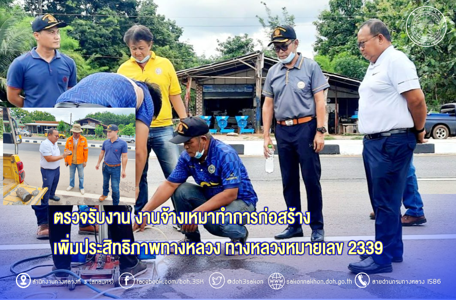 วันที่ 17 สิงหาคม 2565 เวลา 13.00 น. นายวุฒิพงศ์ คำภูแสน รองผู้อำนวยการสำนักงานทางหลวงที่ 3 ประธานกรรมการตรวจรับพัสดุ พร้อมด้วยคณะกรรมการตรวจรับพัสดุ ลงพื้นที่ตรวจรับงานของโครงการก่อสร้างทางหลวงปี 2565 สัญญาเลขที่ สน.21/2565 งานจ้างเหมาทำการก่อสร้างเพิ่มประสิทธิภาพทางหลวง ทางหลวงหมายเลข 2339 ตอน ศรีวิชา – ก่วนบุ่น ห้างหุ้นส่วนจำกัด ศิริสินก่อสร้าง เป็นผู้รับจ้าง เพื่อให้การดำเนินงานก่อสร้างทางหลวงแผ่นดินได้ตามแบบมาตรฐานของกรมทางหลวง กระทรวงคมนาคม ควบคุมงานก่อสร้างโดยส่วนควบคุมงานก่อสร้าง สำนักงานทางหลวงที่ 3 (สกลนคร)
