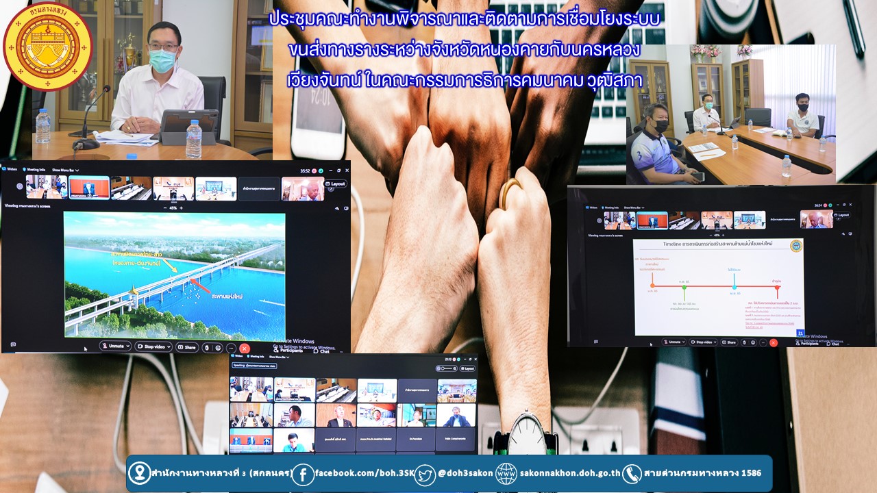 วันที่ 30 สิงหาคม 2565 เวลา 14.30 น. นายพัลลภ จันทร์งามปภากูล ผู้อำนวยการสำนักงานทางหลวงที่ 3 พร้อมด้วยนายชินนพัทธ์ มุลทาทอง ผู้อำนวยการส่วนแผนงาน และ นายธนพนธ์ กิตติธรรม นายช่างโยธาชำนาญงาน ส่วนแผนงาน ร่วมประชุมคณะทำงานพิจารณาและติดตามการเชื่อมโยงระบบขนส่งทางรางระหว่างจังหวัดหนองคายกับนครหลวงเวียงจันทน์ ในคณะกรรมาธิการคมนาคม วุฒิสภาโดยผ่านระบบ Cisco Webex Meeting
