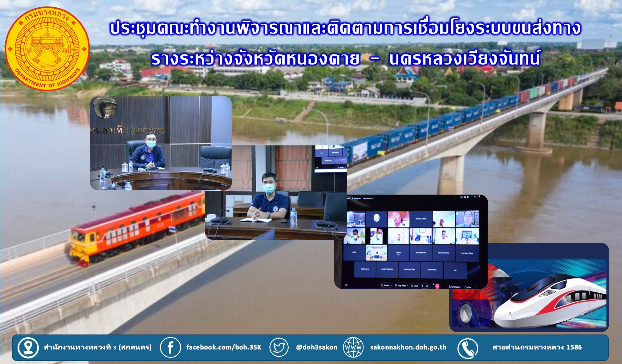 วันที่ 25 ตุลาคม 2565 เวลา 15.00 น. นายพัลลภ จันทร์งามปภากูล ผู้อำนวยการสำนักงานทางหลวงที่ 3 พร้อมด้วย นายชินนพัทธ์ มุลทาทอง ผู้อำนวยการส่วนแผนงาน ร่วมประชุมคณะทำงานพิจารณาและติดตามการเชื่อมโยงระบบขนส่งทางรางระหว่างจังหวัดหนองคาย - นครหลวงเวียงจันทน์ โดยผ่านระบบ Cisco Webex Meeting ณ ห้องประชุม ทวีพัฒน์ ตินะมาส ชั้น 3 อาคารหลังใหม่