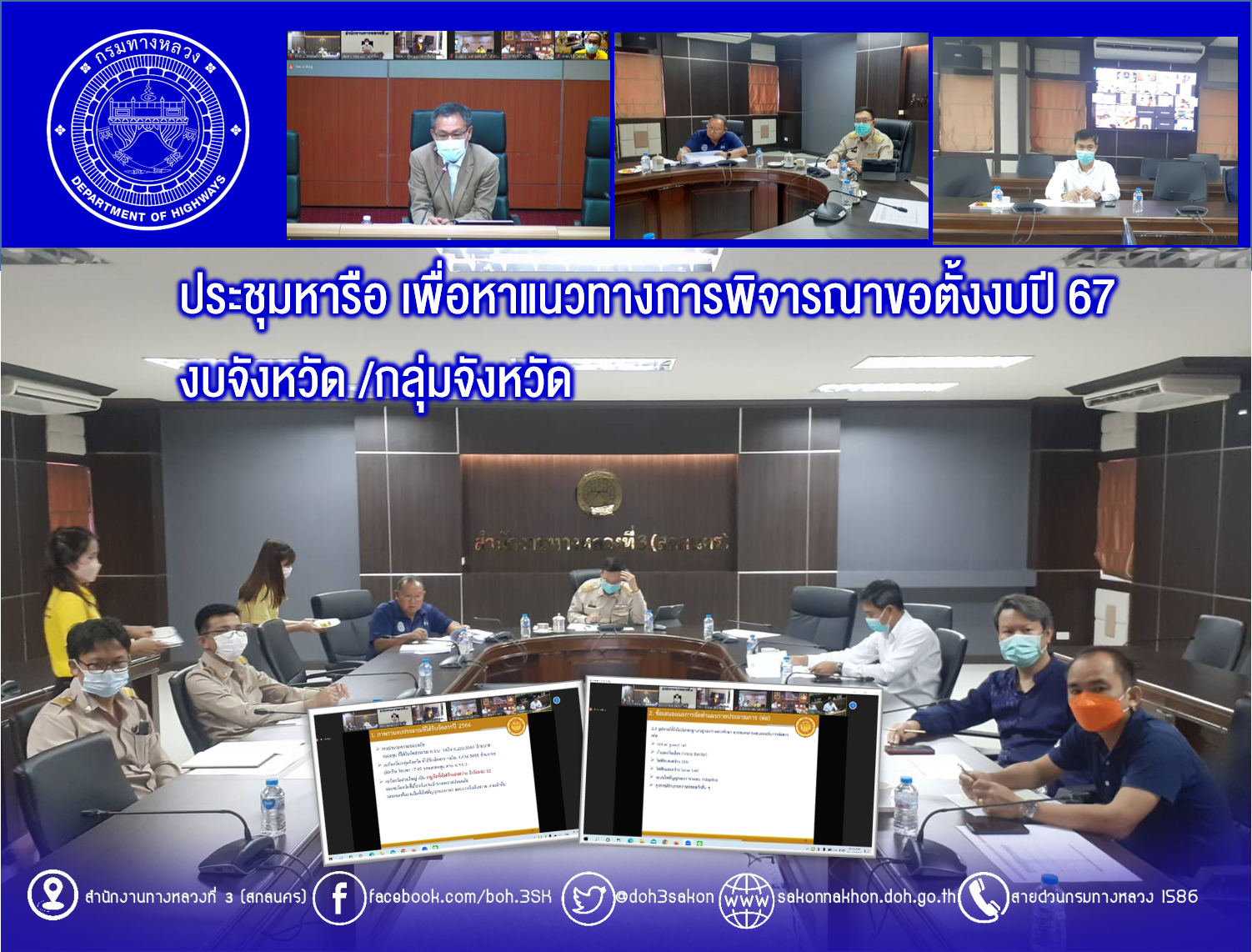 วันที่ 31 ตุลาคม 2565 เวลา 10.00 น. ณ ห้องประชุมทวีพัฒน์ ตินะมาส ชั้น 3 อาคารหลังใหม่ นายพัลลภ จันทร์งามปภากูล ผู้อำนวยการสำนักงานทางหลวงที่ 3 พร้อมด้วย นายวุฒิพงศ์ คำภูแสน รองผู้อำนวยการสำนักงานทางหลวงที่ 3 ตำแหน่งที่ 1 นายประวัติ เสวตวงษ์ รองผู้อำนวยการสำนักงานทางหลวงที่ 3 ตำแหน่งที่ 2 นายชินนพัทธ์ มุลทาทอง ผู้อำนวยการส่วนแผนงาน และวิศวกรโยธา นายช่างโยธา ส่วนแผนงาน ร่วมประชุมหารือ เพื่อหาแนวทางการพิจารณาขอตั้งงบปี 67 งบจังหวัด /กลุ่มจังหวัด โดยผ่านระบบ Zoom Cloud Meeting ของกรมทางหลวง มีนายมนตรี เดชาสกุลสม รองอธิบดีกรมทางหลวง เป็นประธาน ในการประชุมครั้งนี้มีหน่วยงานสังกัดกรมทางหลวง ทั้ง 18 สำนักงานทางหลวง เข้าร่วมประชุมด้วย
