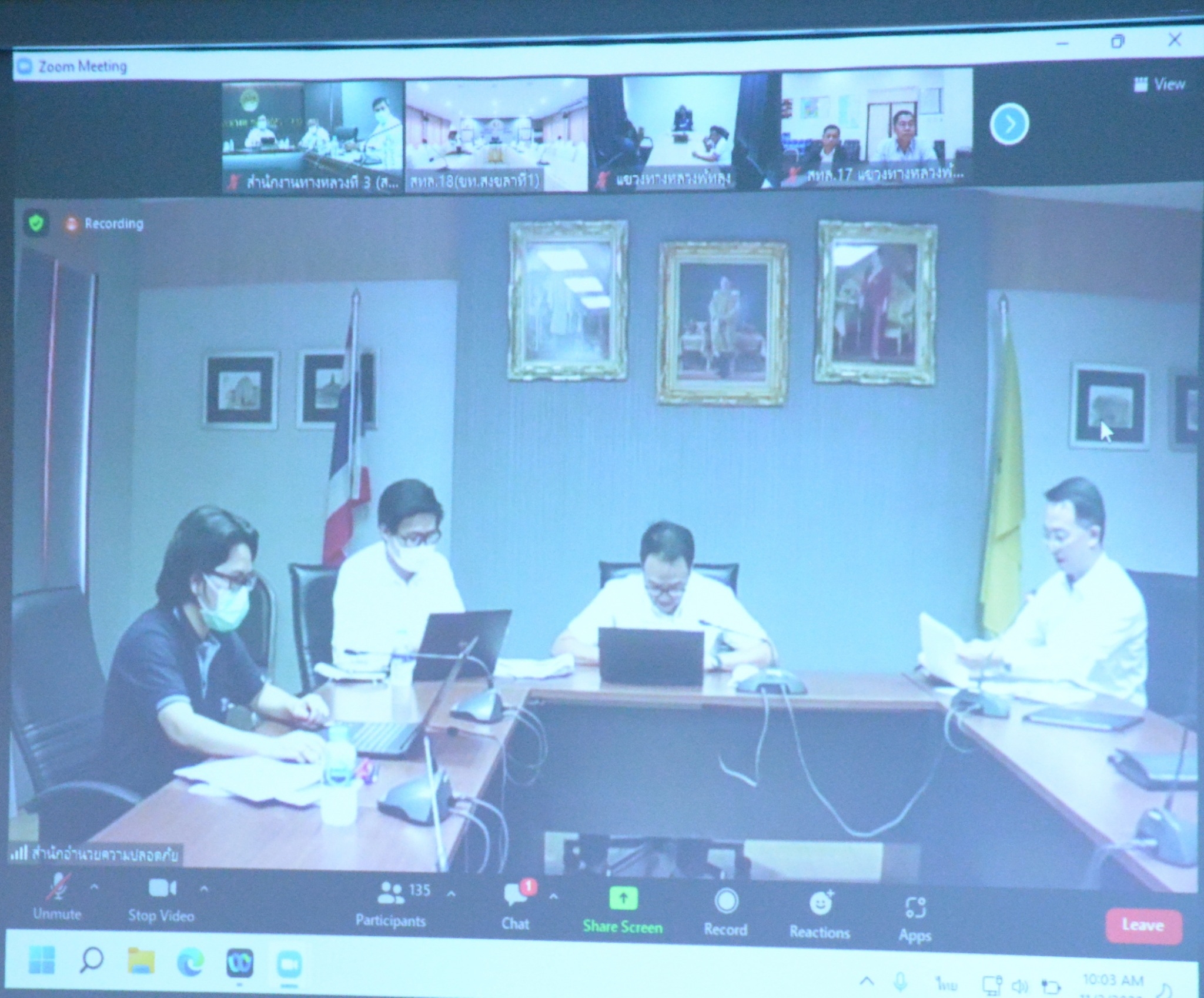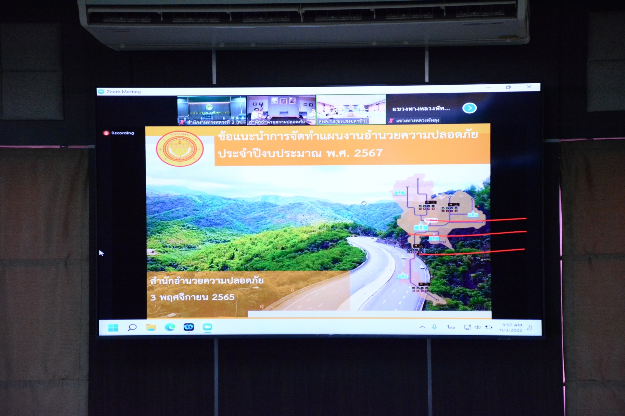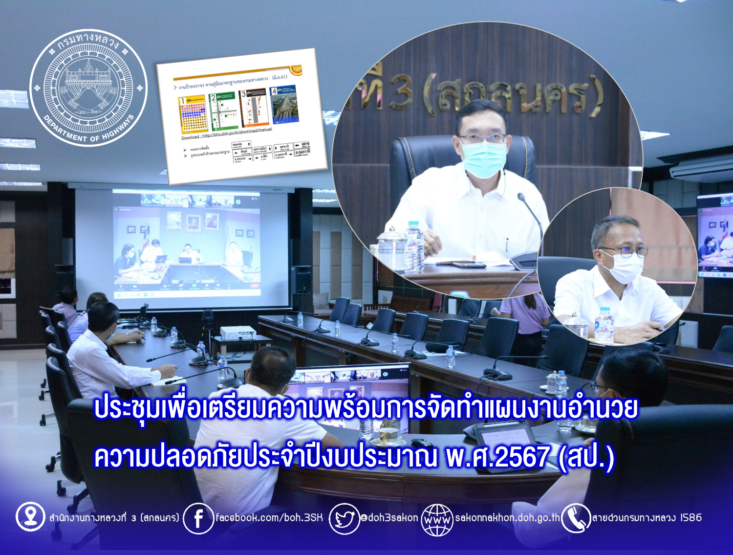 วันที่ 3 พฤศจิกายน 2565 เวลา 10.00 น. ณ ห้องประชุมทวีพัฒน์ ตินะมาส ชั้น 3 อาคารหลังใหม่ นายพัลลภ จันทร์งามปภากูล ผู้อำนวยการสำนักงานทางหลวงที่ 3 พร้อมด้วย นายประวัติ เสวตวงษ์ รองผู้อำนวยการสำนักงานทางหลวงที่ 3 นายชินนพัทธ์ มุลทาทอง ผู้อำนวยการส่วนแผนงาน และวิศวกรโยธา นายช่างโยธา ส่วนแผนงาน ร่วมประชุมเพื่อเตรียมความพร้อมการจัดทำแผนงานอำนวยความปลอดภัยประจำปีงบประมาณ พ.ศ.2567 (สป.) โดยผ่านระบบ Zoom Cloud Meeting ของกรมทางหลวง โดยมีนายสืบพันธ์ ไพศาลวัฒนา ผู้อำนวยการสำนักอำนวยความปลอดภัย เป็นประธาน ในการประชุมครั้งนี้มีหน่วยงานสังกัดกรมทางหลวง ทั้ง 18 สำนักงานทางหลวง เข้าร่วมประชุมด้วย