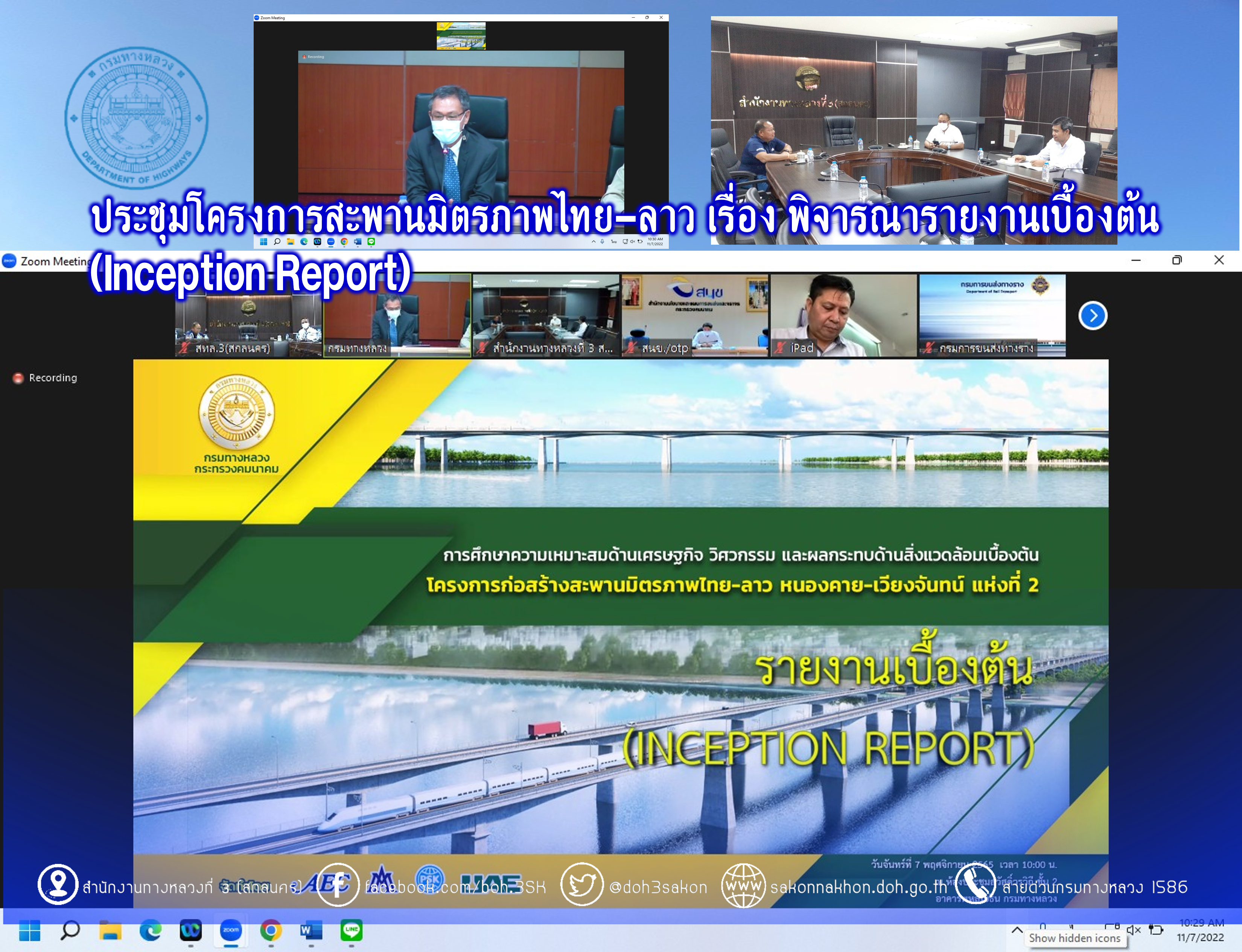 วันที่ 7 พฤศจิกายน 2565 เวลา 10.00 น.นายวุฒิพงศ์ คำภูแสน รองผู้อำนวยการสำนักงานทางหลวงที่ 3 ตำแหน่งที่ 1พร้อมด้วย นายประวัติ เสวตวงษ์ รองผู้อำนวยการสำนักงานทางหลวงที่ 3 ตำแหน่งที่ 2และนายชินนพัทธ์ มุลทาทอง ผู้อำนวยการส่วนแผนงาน ร่วมประชุมโครงการสะพานมิตรภาพไทย-ลาว เรื่อง พิจารณารายงานเบื้องต้น (Inception Report) ผ่านระบบ Zoom Meeting ของกรมทางหลวง โดยมีนายมนตรี เดชาสกุลสม รองอธิบดีกรมทางหลวง เป็นประธาน