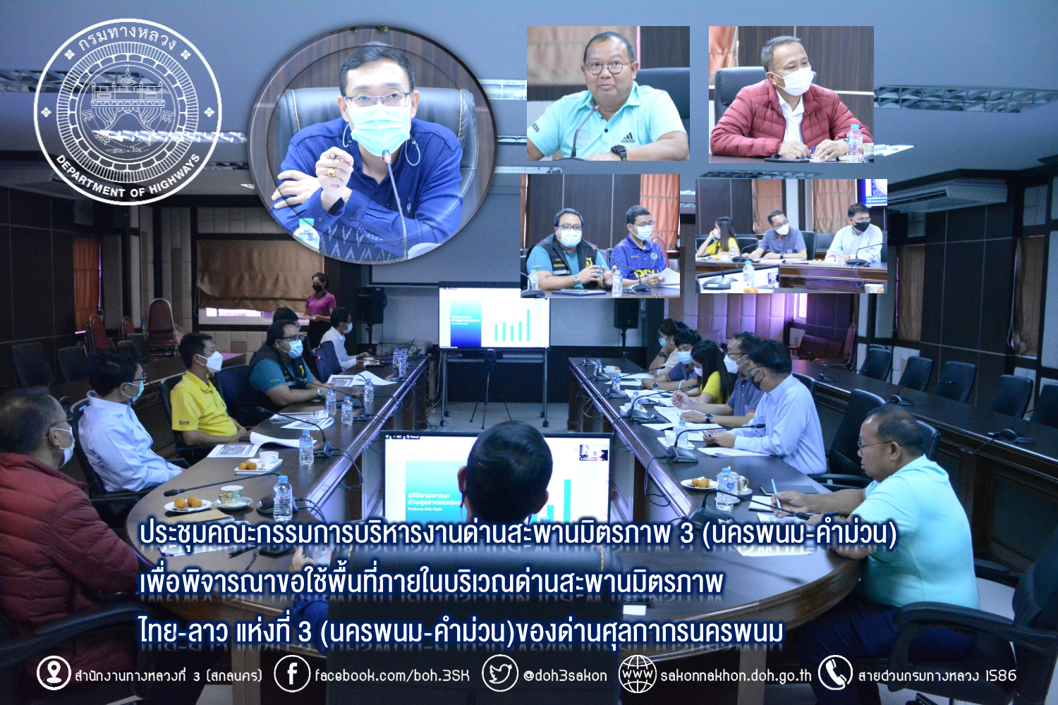 วันที่ 9 พฤศจิกายน 2565 เวลา 13.30 น. นายพัลลภ จันทร์งามปภากูล ผู้อำนวยการสำนักงานทางหลวงที่ 3 เป็นประธาน ประชุมคณะกรรมการบริหารงานด่านสะพานมิตรภาพ 3 (นครพนม-คำม่วน) เพื่อพิจารณาขอใช้พื้นที่ภายในบริเวณด่านสะพานมิตรภาพไทย-ลาว แห่งที่ 3 (นครพนม-คำม่วน) ของด่านศุลกากรนครพนม มีนายวุฒิพงศ์ คำภูแสน รองผู้อำนวยการสำนักงานทางหลวงที่ 3 ตำแหน่งที่ 1 นายประวัติ เสวตวงษ์ รองผู้อำนวยการสำนักงานทางหลวงที่ 3 ตำแหน่งที่ 2 นายเดชา พรวนพิทักษ์ ผู้ออำนวยการแขวงทางหลวงนครพนม นางนภาพิศ สุวรรณศรี ผู้อำนวยการส่วนบริหาร นายหนูกาญ เจริญไชย ผู้อำนวยการส่วนกฎหมายและกรรมสิทธิ์ที่ดิน นายวีรวัฒน์ บุ่งนาแซง นิติกรปฏิบัติตการ และตัวแทนด่านศุลกากรนครพนม ร่วมประชุมพร้อมนำเสนอและบรรยายสรุปการขอใช้พื้นที่ภายในบริเวณด่านสะพานมิตรภาพไทย-ลาว แห่งที่ 3 (นครพนม-คำม่วน) ของด่านศุลกากรนครพนม