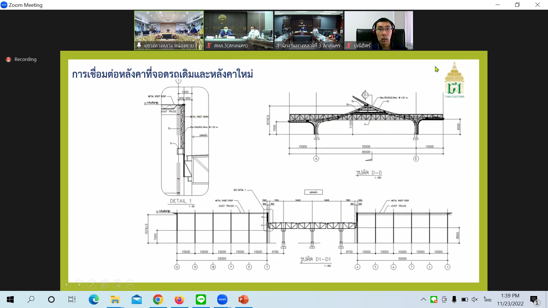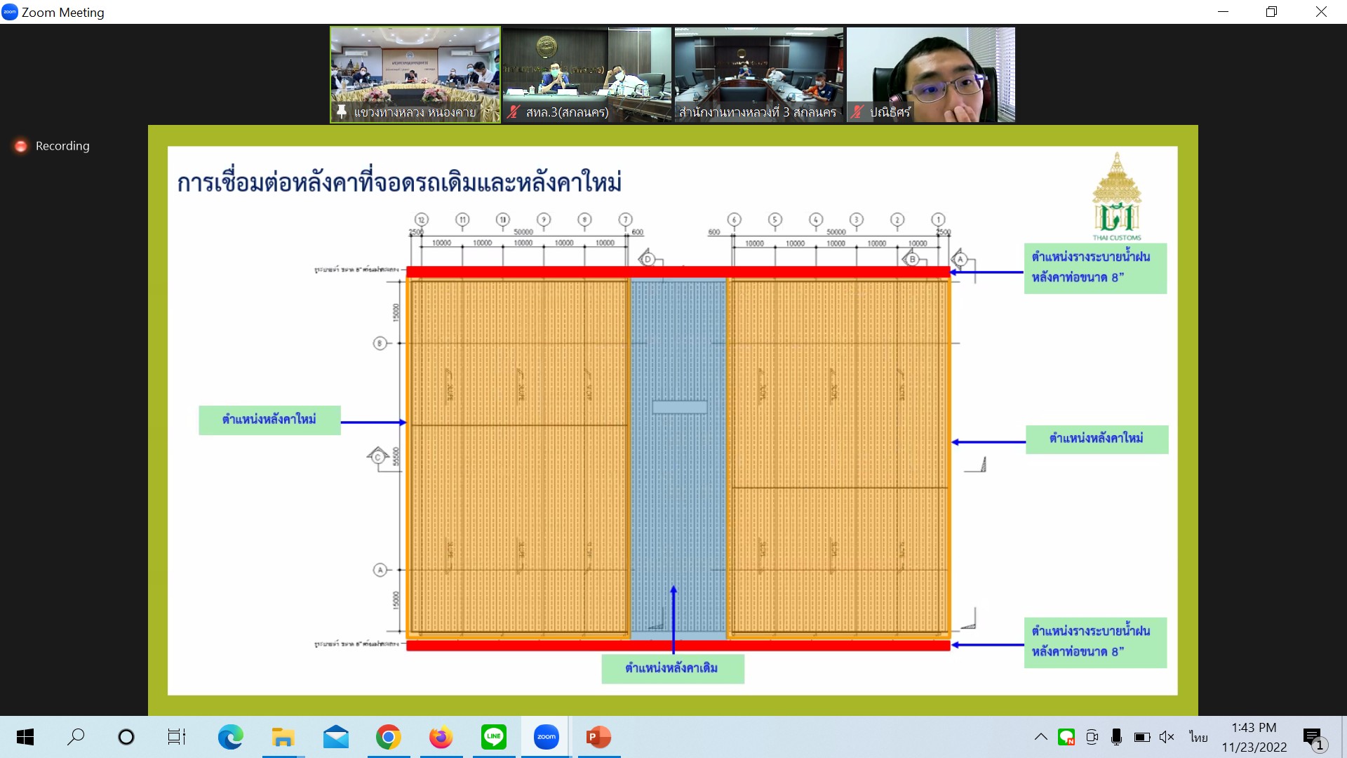 วันที่ 23 พฤศจิกายน 2565 เวลา 13.30 น. นายพัลลภ จันทร์งามปภากูล ผู้อำนวยการสำนักงานทางหลวงที่ 3 เป็นประธาน ประชุม comment ให้ทางศุลกากรหนองคาย ปรับแก้ไขแบบ เพื่อพิจารณาขอใช้พื้นที่สะพานมิตรภาพ ไทย - ลาวแห่งที่ 1 (หนองคาย-เวียงจันทน์) ของศุลกากรหนองคาย ในการประชุมครั้งนี้มีนายประวัติ เสวตวงษ์ รองผู้อำนวยการสำนักงานทางหลวงที่ 3 และนายธนพนธ์ กิตติธรรม นายช่างโยธาชำนาญงาน ส่วนแผนงาน ร่วมประชุม ณ ห้องประชุมทวีพัฒน ตินะมาส ชั้น 3 สำนักงานทางหลวงที่ 3 อาคารหลังใหม่ ส่วนผู้อำนวยการแขวงทางหลวงหนองคาย เจ้าหน้าที่ศุลกากรหนองคาย และเจ้าหน้าที่เกี่ยวข้อง ร่วมประชุมผ่านระบบ Zoom Cloud Meeting ของสำนักงานทางหลวงที่ 3 (สกลนคร)