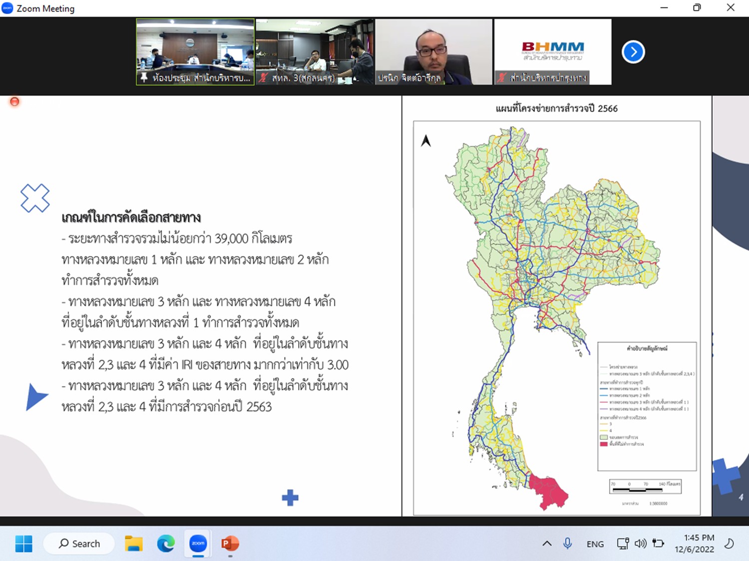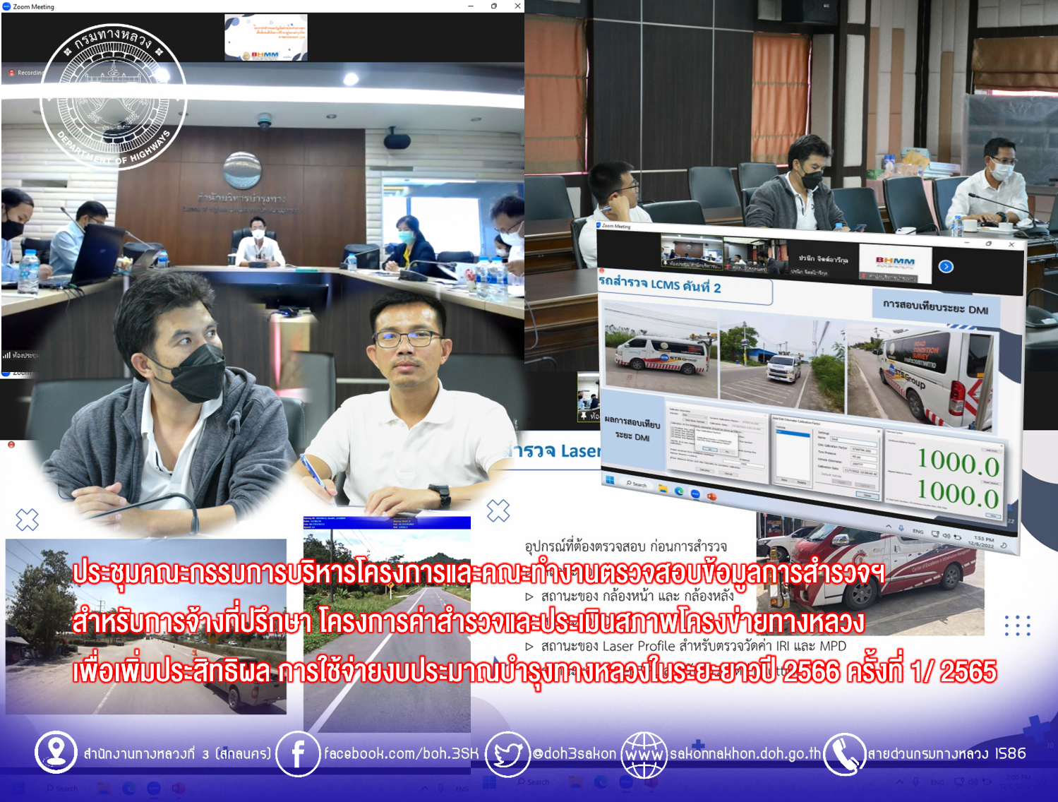นายอำนาจ สาไชยันต์ ผู้อำนวยการส่วนเทคโนโลยีสารสนเทศ พร้อมด้วยนายธนากรณ์ ติยะบุตร วิศวกรโยธาปฏิบัติการ ส่วนแผนงาน แทนผู้อำนวยการส่วนแผนงาน ร่วมประชุมคณะกรรมการบริหารโครงการและคณะทำงานตรวจสอบข้อมูลการสำรวจฯสำหรับการจ้างที่ปรึกษา โครงการค่าสำรวจและประเมินสภาพโครงข่ายทางหลวงเพื่อเพิ่มประสิทธิผล การใช้จ่ายงบประมาณบำรุงทางหลวงในระยะยาวปี 2566 ครั้งที่1/2565 ผ่านระบบ Zoom Cloud Meeting ณ ห้องประชุมทวีพัฒน์ ตินะมาส อาคารสำนักงานทางหลวงที่ 3(สกลนคร) หลังใหม่