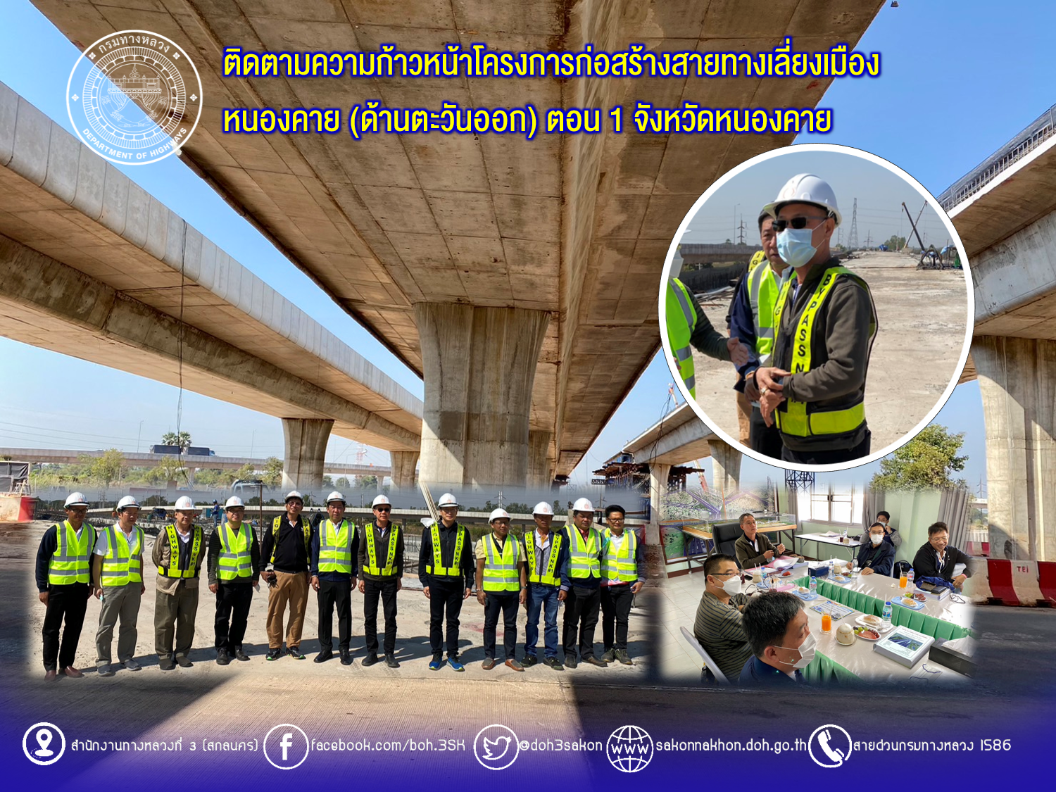 วันที่ 18 ธันวาคม 2565 เวลา 10.00 น. นายมนตรี เดชาสกุลสม รองอธิบดีกรมทางหลวง ประธานกรรมการตรวจรับพัสดุ พร้อมด้วยนายพัลลภ จันทร์งามปภากูล ผู้อำนวยการสำนักงานทางหลวงที่ 3 กรรมการตรวจรับพัสดุ และคณะกรรมการตรวจรับพัสดุ ลงพื้นที่ติดตามความก้าวหน้าโครงการก่อสร้างสายทางเลี่ยงเมืองหนองคาย (ด้านตะวันออก) ตอน 1 จังหวัดหนองคาย บนทางหลวงหมายเลข 2 ระหว่าง กม.502+000 - กม.507+750 ระยะทางรวม 5.750 กม. วงเงินงบประมาณ 1,544,634,300บาท (ตรวจรับงานงวดที่ 21) เพื่อให้การดำเนินงานก่อสร้างทางหลวงแผ่นดินได้ตามแบบมาตรฐานของกรมทางหลวง กระทรวงคมนาคม ควบคุมการก่อสร้างโดยสำนักก่อสร้างทางที่ 2 มีโดยมี บริษัท ซิโน-ไทย เอ็นจีเนียริ่ง แอนด์ คอนสตรัคชั่น จำกัด(มหาชน) เป็นผู้รับจ้าง พร้อมรับฟังบรรยายสรุปผลการดำเนินงานของโครงการฯ ณ ห้องประชุมสำนักงานชั่วคราวของโครงการฯ