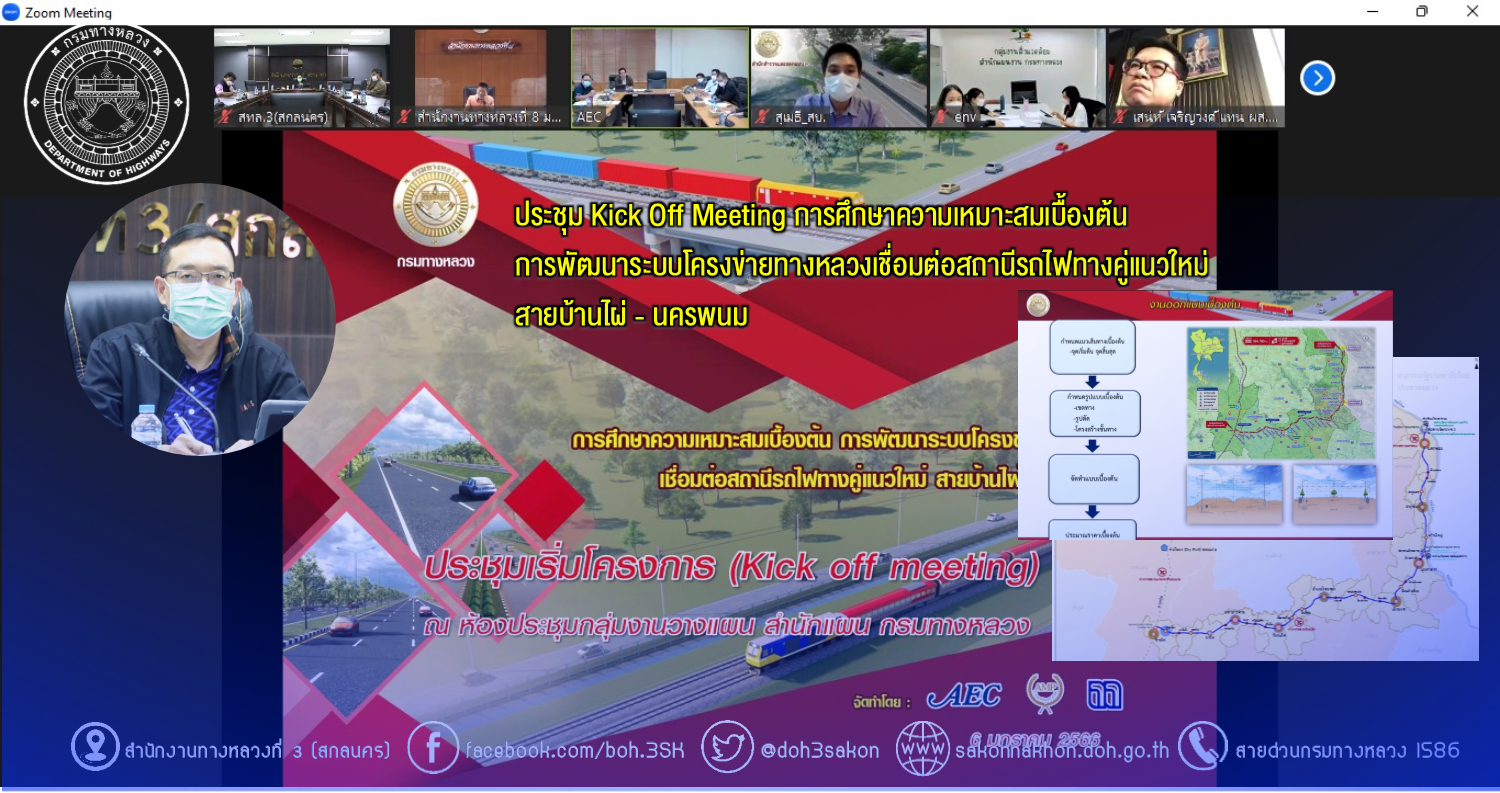 นายพัลลภ จันทร์งามปภากูล ผู้อำนวยการสำนักงานทางหลวงที่ 3 พร้อมด้วย นายพงษ์ศักดิ์ อาจลา ผู้อำนวยการส่วนสำรวจและออกแบบ และ นายชินนพัทธ์ มุลทาทอง ผู้อำนวยการส่วนแผนงาน เข้าร่วมประชุม Kick Off Meeting การศึกษาความเหมาะสม เบื้องต้น การพัฒนาระบบโครงข่ายทางหลวงเชื่อมต่อสถานีรถไฟทางคู่แนวใหม่ สายบ้านไผ่ - นครพนม