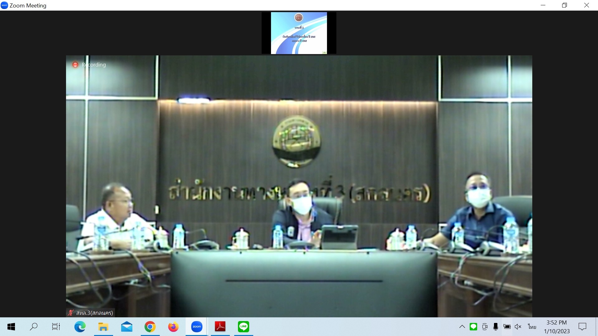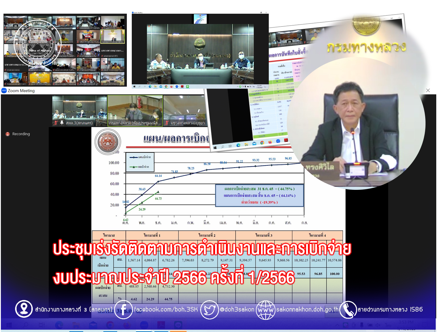 สำนักงานทางหลวงที่ 3 (สกลนคร) นายพัลลภ จันทร์งามปภากูล ผู้อำนวยการสำนักงานทางหลวงที่ 3 พร้อมด้วยนายวุฒิพงศ์ คำภูแสน รองผู้อำนวยการสำนักงานทางหลวงที่ 3 ตำแหน่งที 1 นายประวัติ เสวตวงษ์ รองผู้อำนวยการสำนักงานทางหลวงที่ 3 ตำแหน่งที่ 2 นายชินนพัทธ์ มุลทาทอง ผู้อำนวยการส่วนแผนงาน นายหนูกาญ เจริญไชย ผู้อำนวยการส่วนกฎหมายและกรรมสิทธิ์ที่ดิน อำนาจ สาไชยันต์ ผู้อำนวยการส่วนเทคโนโลยีสารสนเทศ และวิศวกรโยธาส่วนแผนงาน ร่วมประชุมเร่งรัดติดตามการดำเนินงานและการเบิกจ่ายงบประมาณประจำปี 2566 ผ่านระบบ Zoom Cloud Meeting ณ ห้องประชุมทวีพัฒน์ ตินะมาส อาคารหลังใหม่
