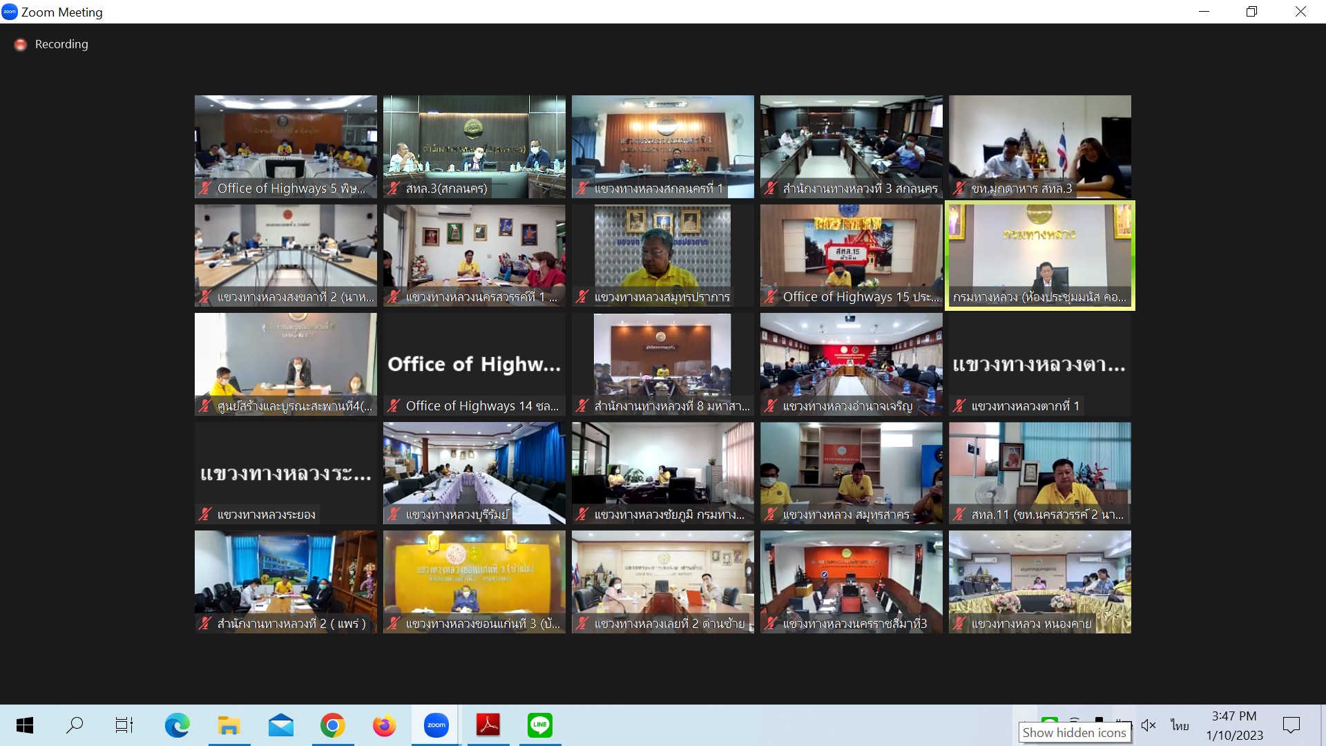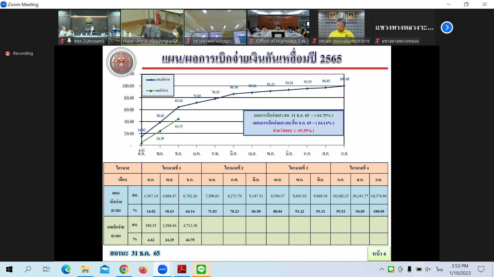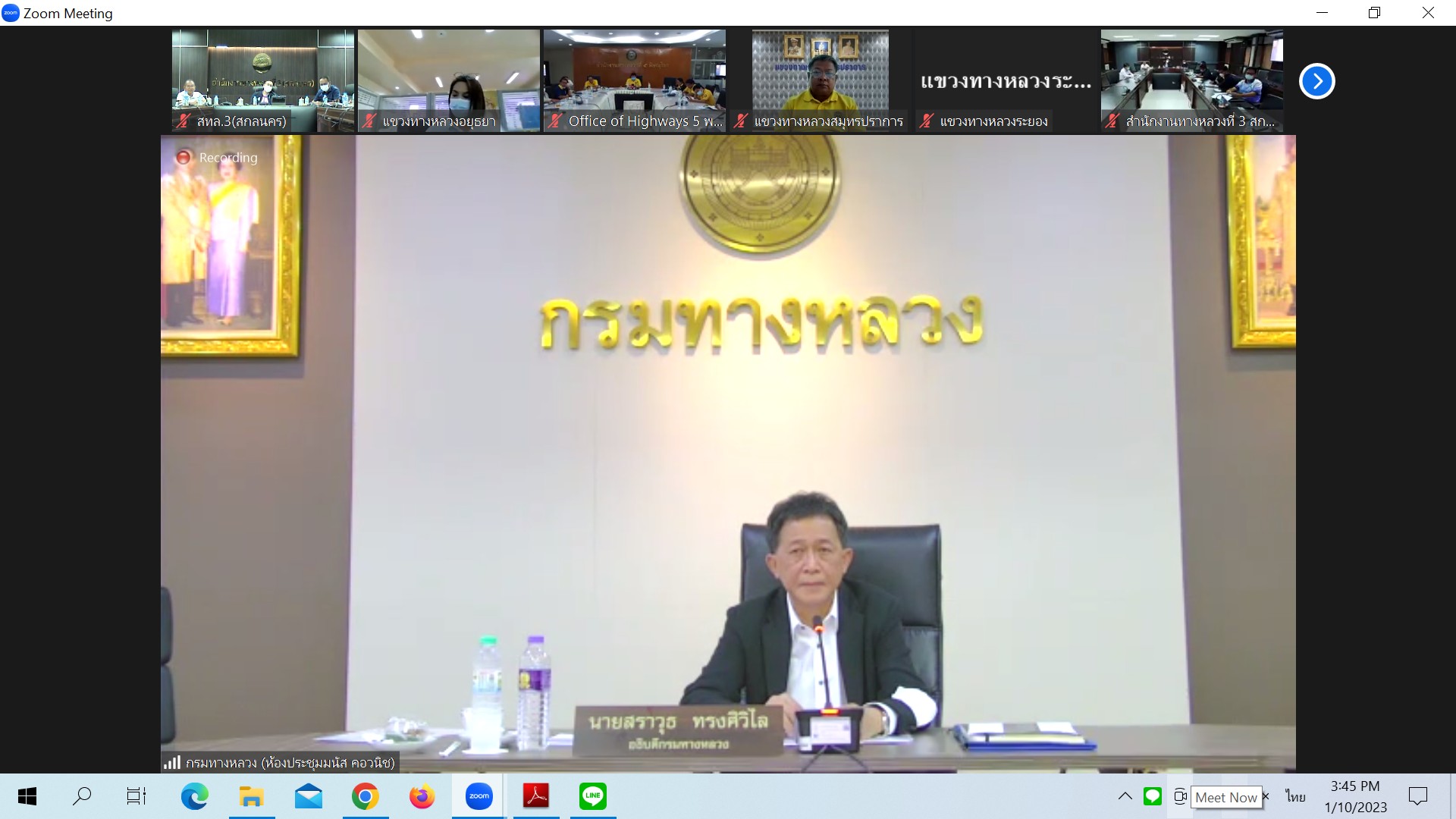 เพื่อติดตามผลการดำเนินงาน และปัญหาอุปสรรคงานก่อสร้างทางหลวงปี2566 ของสำนักงานทางหลวง และศูนย์สร้างทางและสะพาน ในสังกัดกรมทางหลวง ผ่านระบบ Zoom Cloud Meeting จากห้องประชุมมนัส คอวนิช กรมทางหลวง