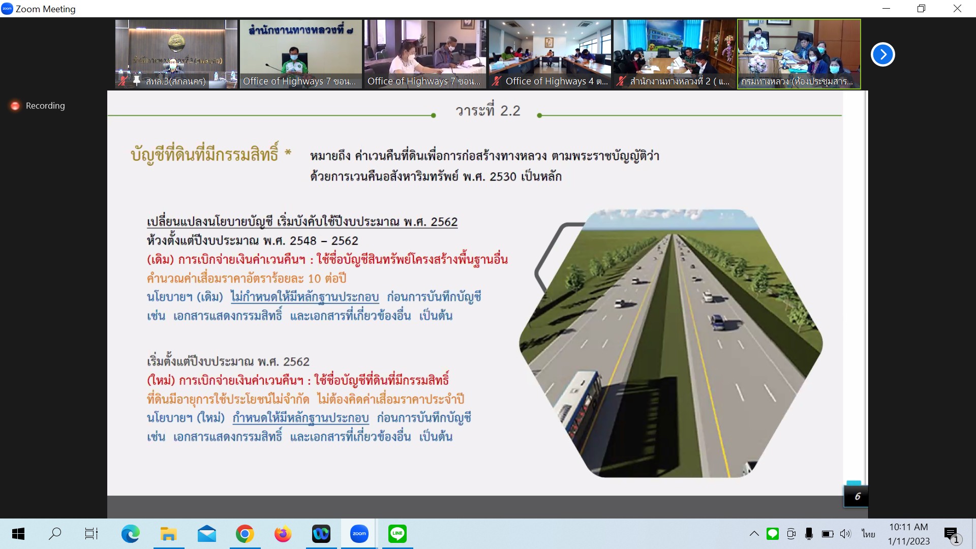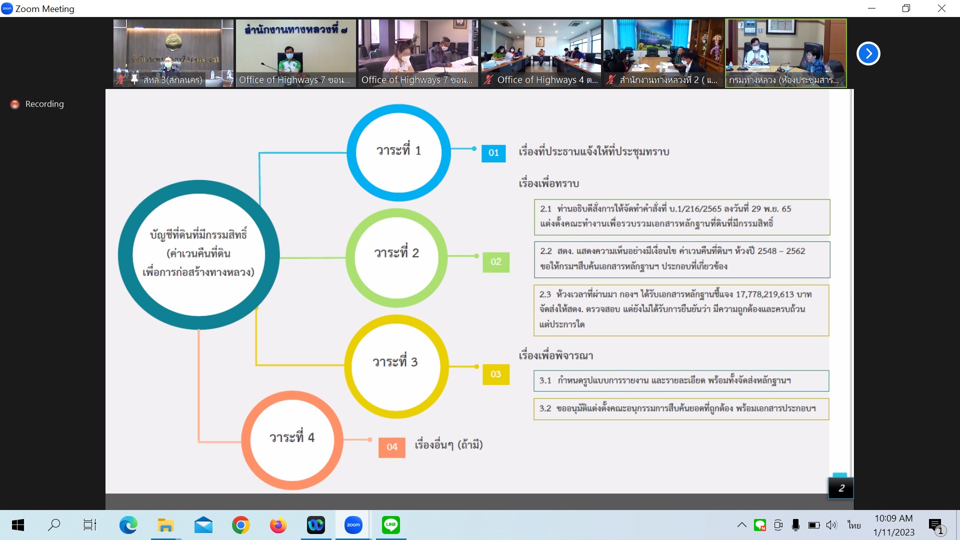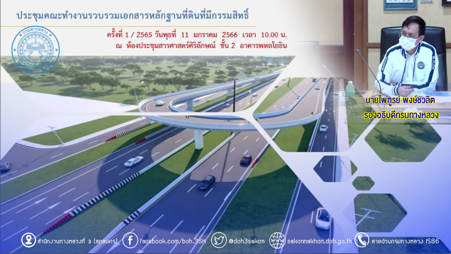 นายไพฑูรย์ พงษ์ชวลิต รองอธิบดีกรมทางหลวง ฝ่ายดำเนินงานเป็นประธาน ประชุมคณะทำงานเพื่อรวบรวมเอกสารหลักฐานที่ดินที่มีกรรมสิทธิ์ ครั้งที่ 1/2566 ผ่านระบบ Zoom Cloud Meeting จากห้องประชุมสารศาสตร์ศิริลักษณ์ ชั้น 2 อาคารพลโยธิน กรมทางหลวง