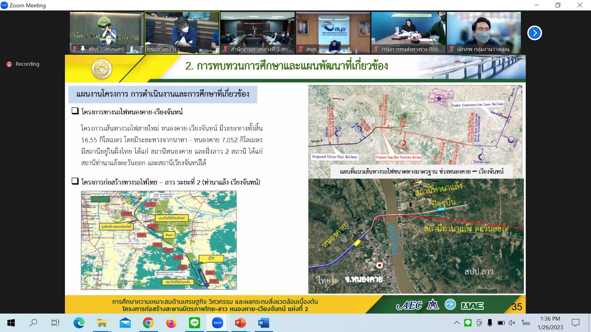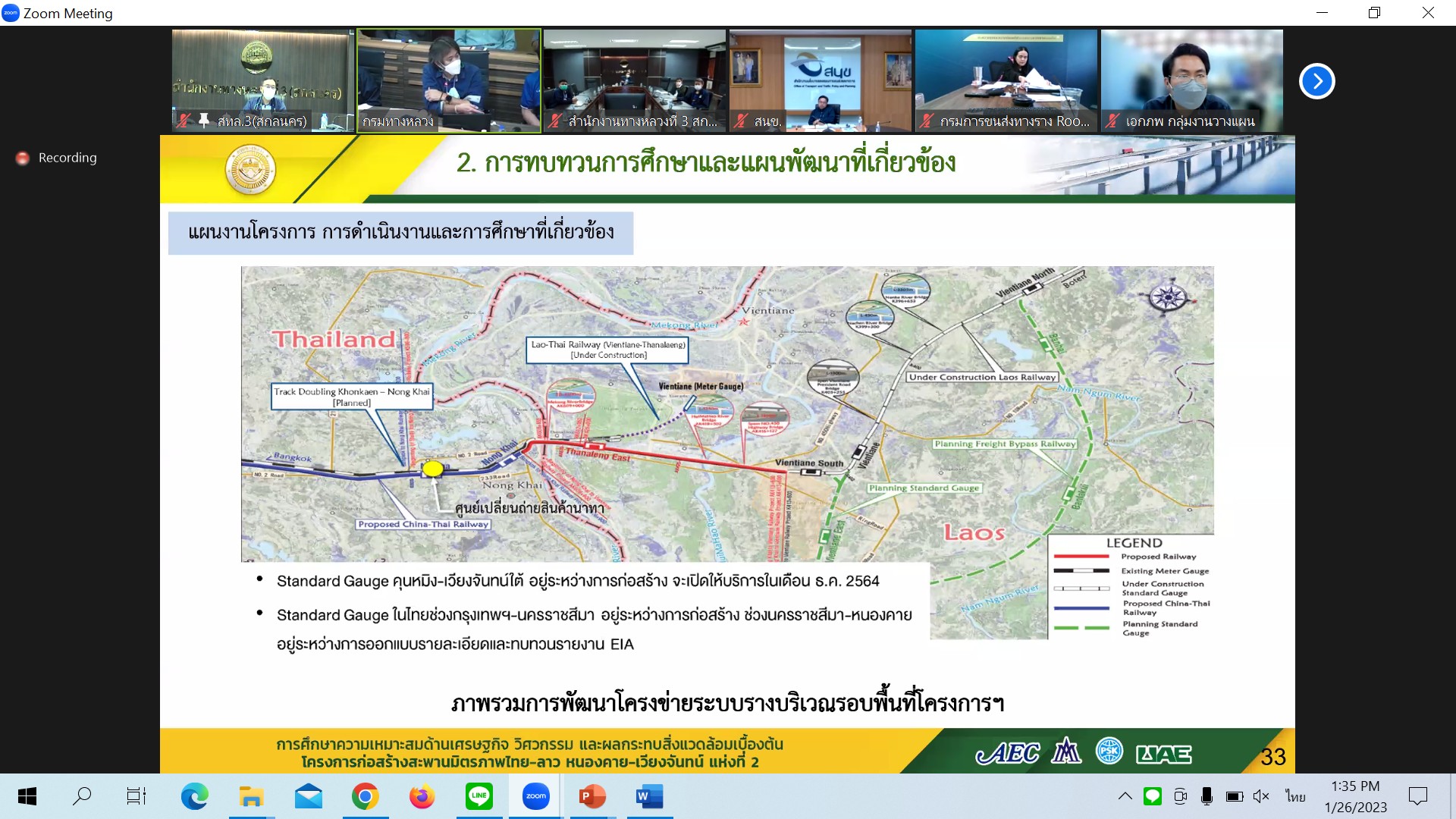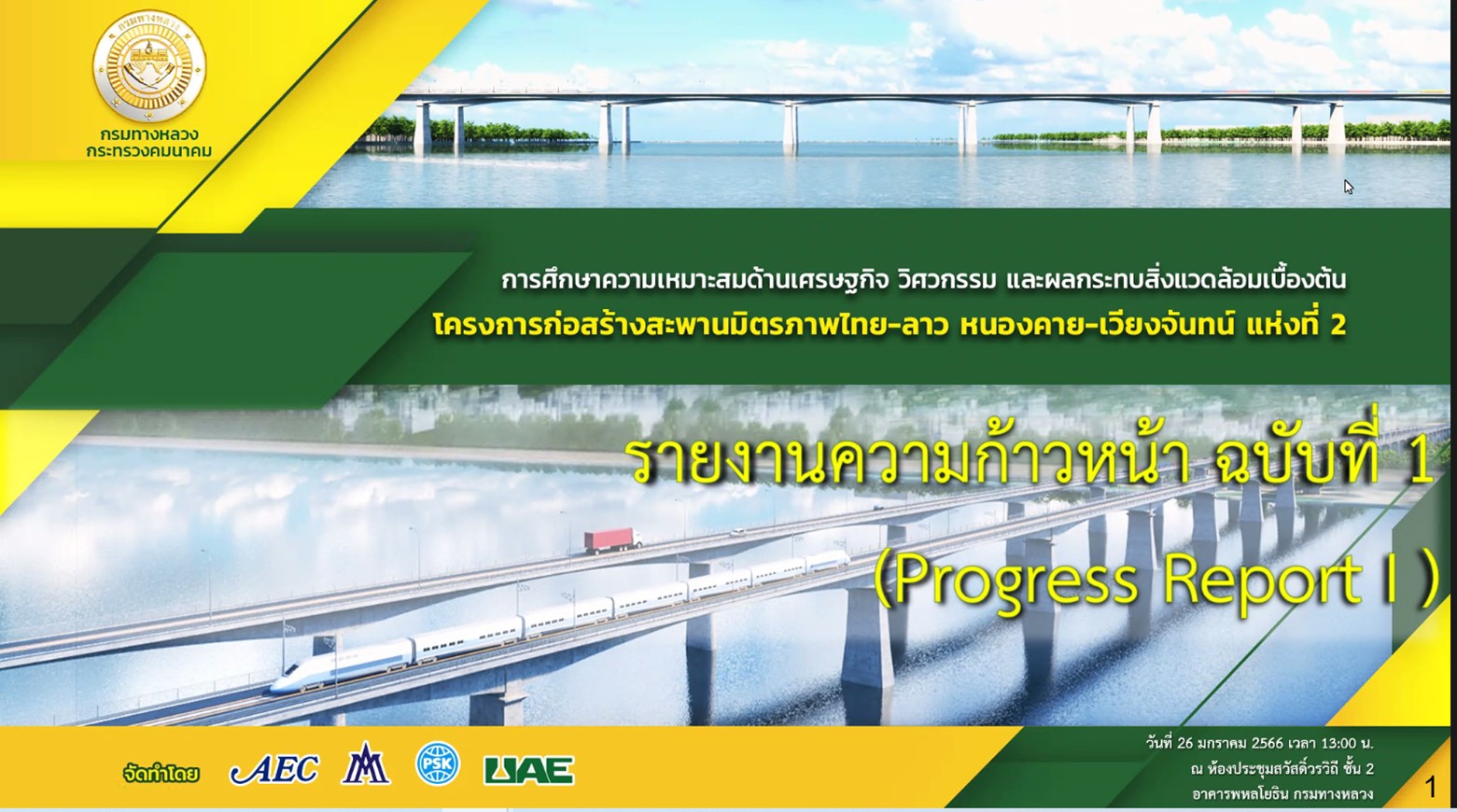 วันที่ 26 มกราคม 2566 เวลา 13.30 น.นายมนตรี เดชาสกุลสม รองอธิบดีกรมทางหลวง ฝ่ายวิชาการเป็นประธาน ประชุมพิจารณารายงานความก้าวหน้าฉบับที่ 1(Progress Report) การศึกษาความเหมาะสมด้านเศรษฐกิจ วิศวกรรม และผลกระทบสิ่งแวดล้อมเบื้องต้น โครงการก่อสร้างสะพานมิตรภาพไทย-ลาว(หนองคาย-เวียงจันทน์ แห่งที่ 2 ผ่านระบบ Zoom Meeting จากห้องประชุมสวัสดิ์วรวิถี ชั้น2 อาคารพหลโยธิน กรมทางหลวง