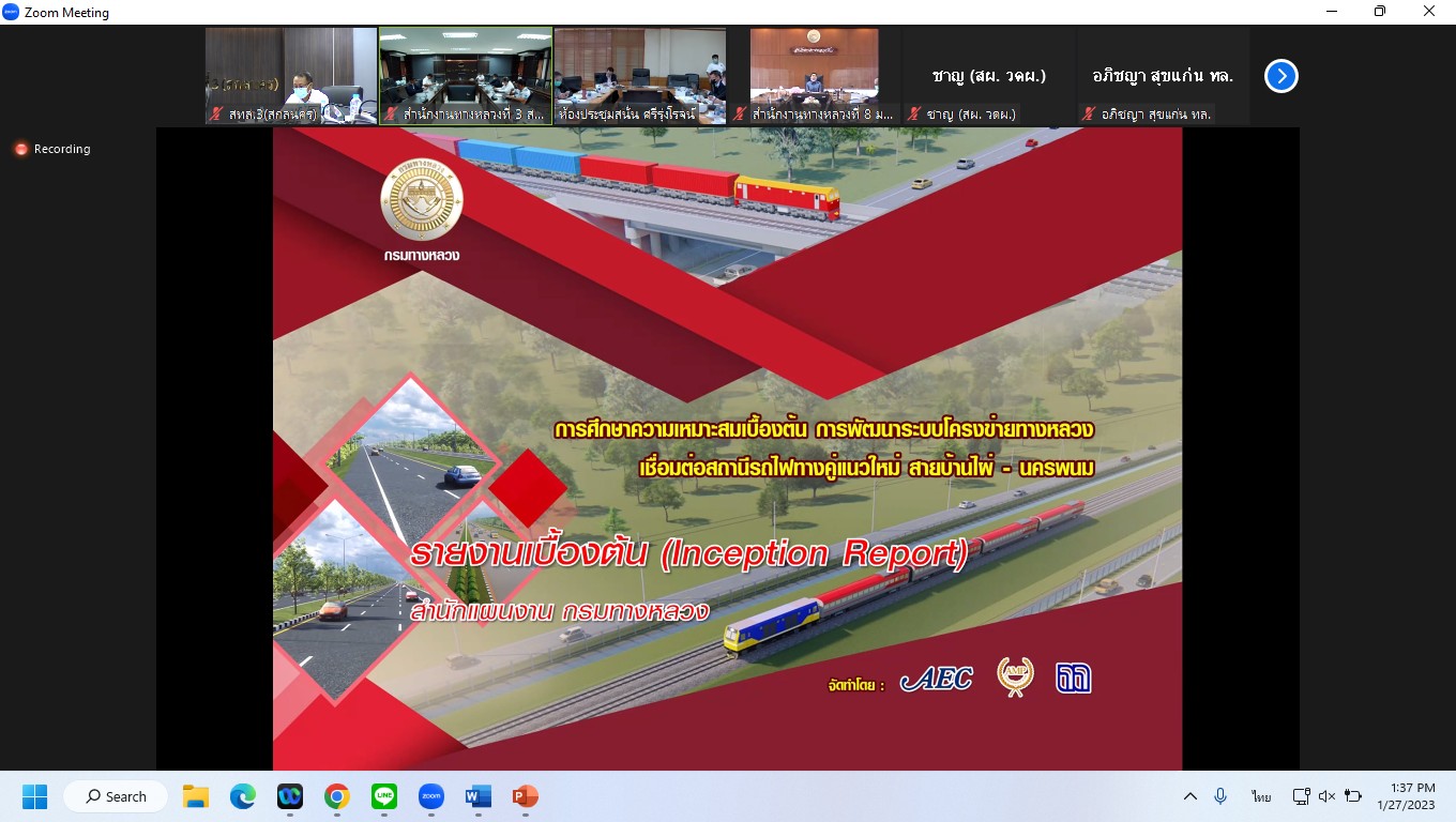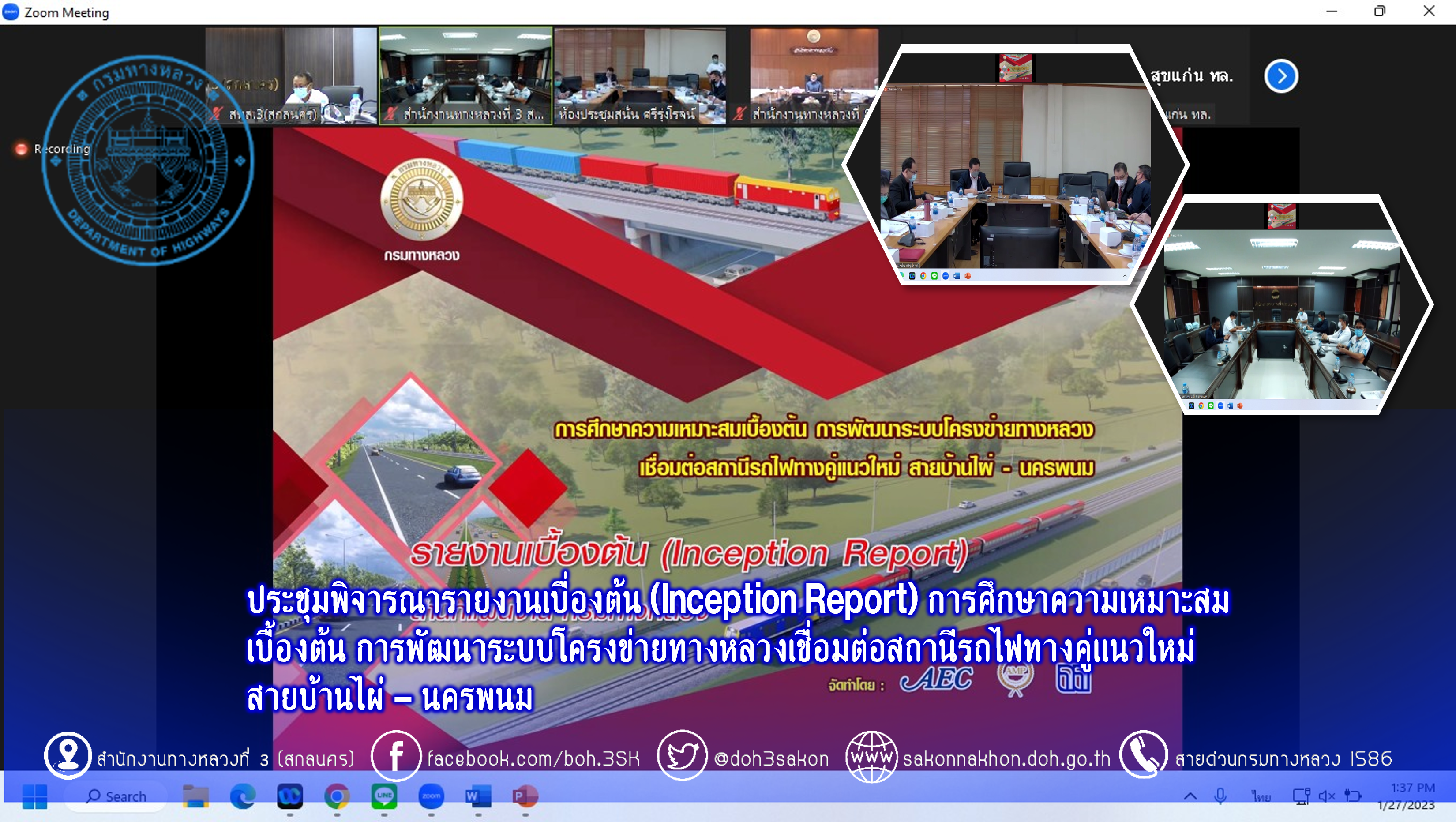วันที่ 27 มกราคม 2566 เวลา 13.30 น. ประชุมพิจารณารายงานเบื่องต้น (Inception Report) การศึกษาความเหมาะสมเบื้องต้น การพัฒนาระบบโครงข่ายทางหลวงเชื่อมต่อสถานีรถไฟทางคู่แนวใหม่ สายบ้านไผ่ - นครพนม ผ่านระบบ Zoom Meeting จากห้องประชุมสสนั่น ศรีรุ่งโรจน์ ชั้น3 อาคารพหลโยธิน กรมทางหลวง