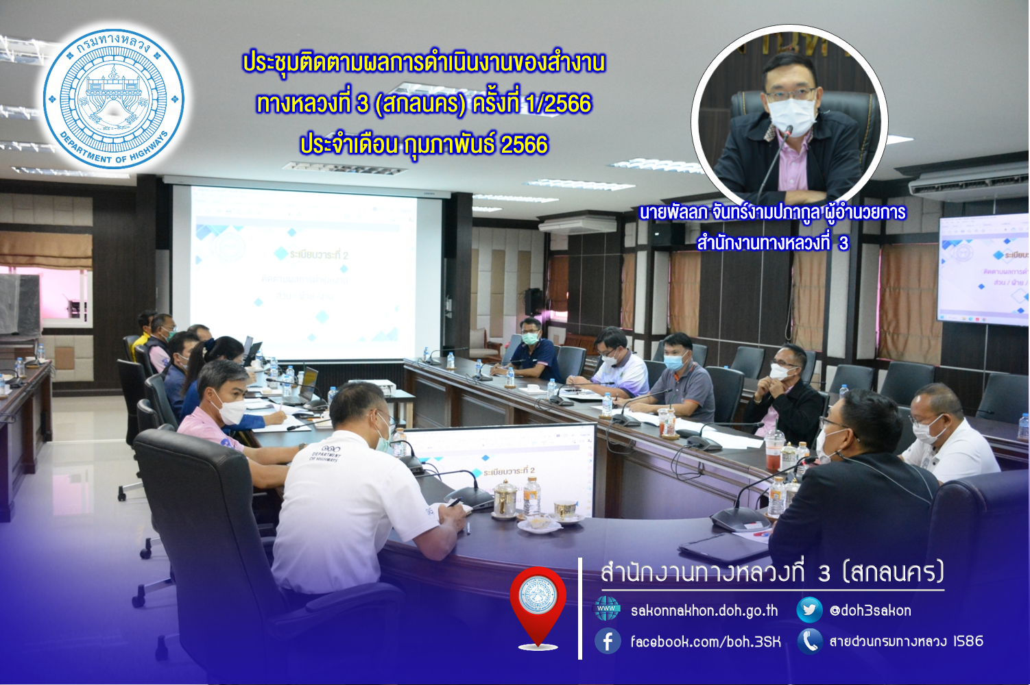 นายพัลลภ จันทร์งามปภากูล ผู้อำนวยการสำนักงานทางหลวงที่ 3 เป็นประธาน ประชุมติดตามผลการดำเนินงานของสำนักงานทางหลวงที่ 3 (สกลนคร) ครั้งที่ 1/2566 ประจำเดือน กุมภาพันธ์ 2566