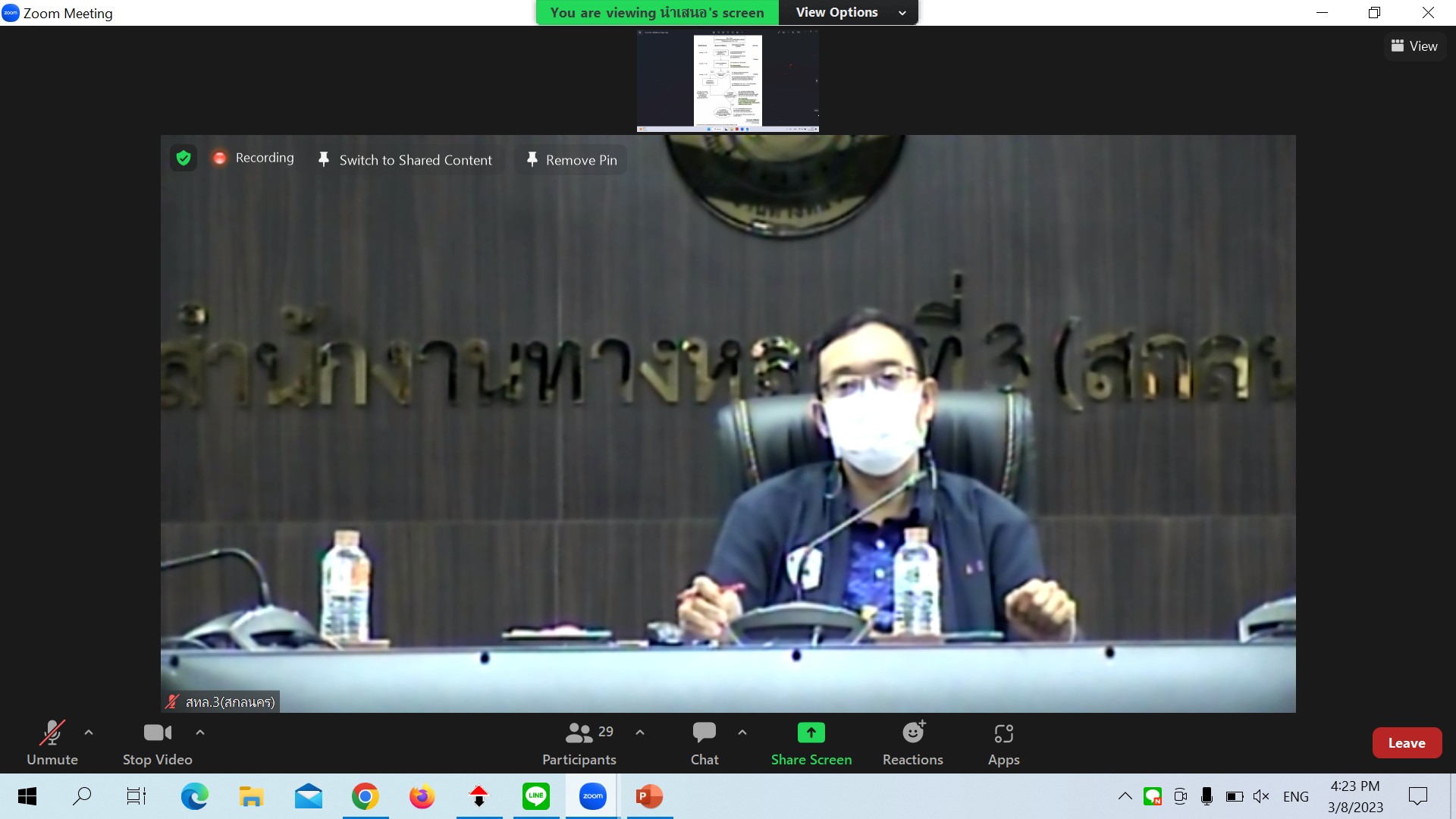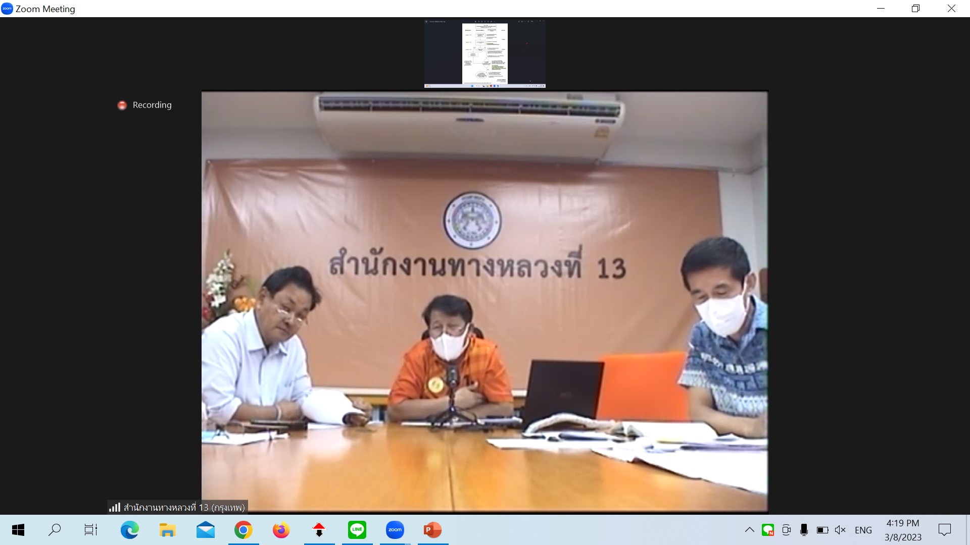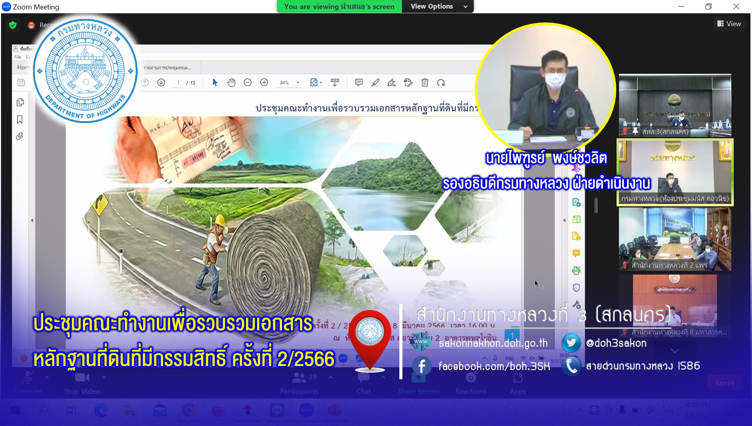 สำนักงานทางหลวงที่ 3 (สกลนคร) นายพัลลภ จันทร์งามปภากูล ผู้อำนวยการสำนักงานทางหลวงที่ 3 พร้อมด้วยนายหนูกาญ เจริญไชย ผู้อำนวยการส่วนกฎหมายและกรรมสิทธิ์ที่ดิน นางรุ่งดาว ชมพูวิเศษ หัวหน้างานการเงินและบัญชี และเจ้าหน้าที่ส่วนกฎหมายและกรรมสิทธิ์ที่ดิน ร่วมประชุมคณะทำงานฯ ครั้งที่ 2/2566 ผ่านระบบ Zoom Cloud Meeting ณ ห้องประชุมทวีพัฒน์ ตินะมาส อาคารหลังใหม่ ในการประชุมครั้งนี้มีหนวยงานในสังกัดกรมทางหลวง ทั้ง 18 สำนักงานทางหลวง เข้าร่วมประชุม