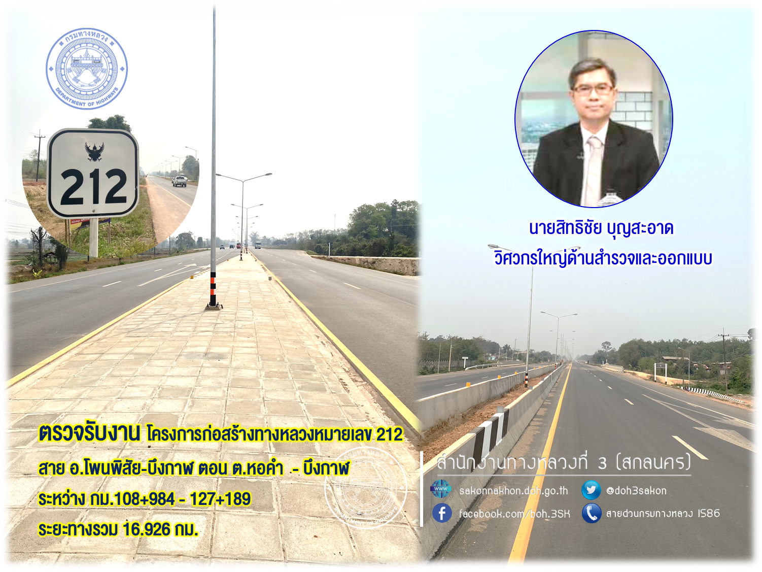 ตรวจรับงานโครงการก่อสร้างทางหลวงหมายเลข 212 สาย อ.โพนพิสัย-บึงกาฬ ตอน ต.หอคำ-บึงกาฬ ระหว่าง กม.108+984 - 127+189 ระยะทางรวม 16.926 กม.