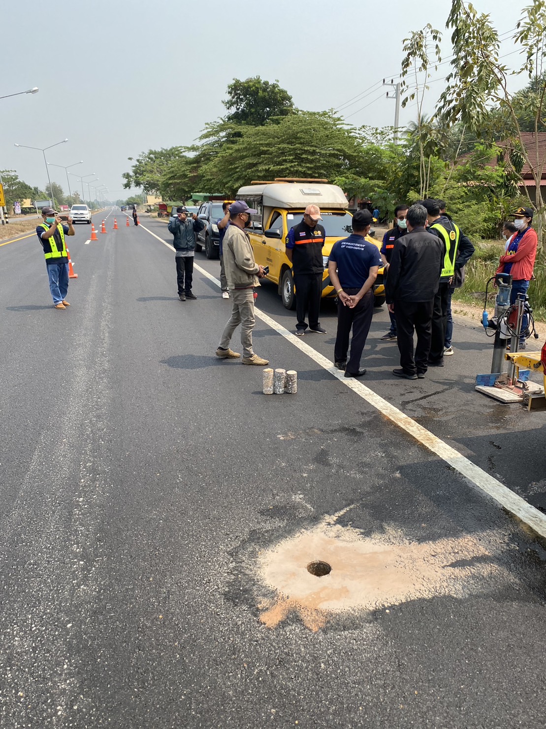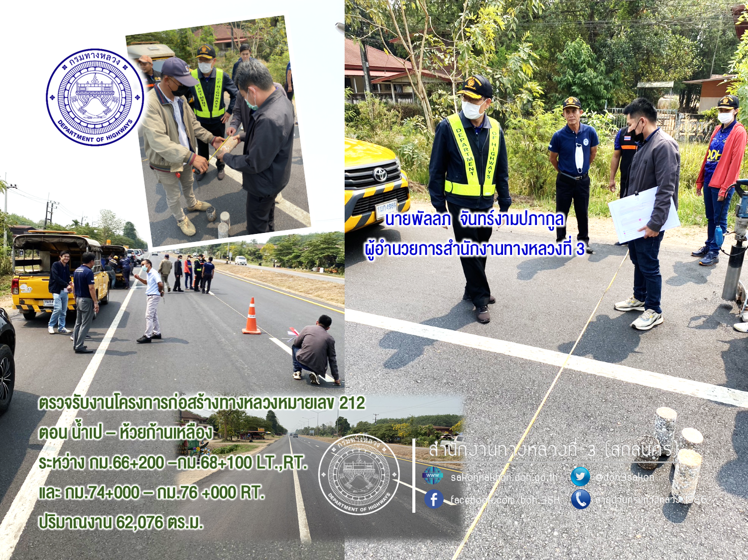 วันที่ 10 มีนาคม 2566 เวลา 10.30 น. นายพัลลภ จันทร์งามปภากูล ผู้อำนวยการสำนักงานทางหลวงที่ 3 ประธานกรรมการตรวจรับพัสดุ พร้อมด้วยนายประวัติ เสวตวงษ์ รองผู้อำนวยการสำนักงานทางหลวงที่ 3 นาย ทวีศักดิ์ เจียมรัตโนภาส กรรมการตรวจรับพัสดุ และคณะกรรมการตรวจรับพัสดุ ลงพื้นที่ติดตามความก้าวหน้าโครงการก่อสร้างทางหลวงหมายเลข 212 ตอน น้ำเป – ห้วยก้านเหลือง ระหว่าง กม.66+200 –กม.68+100LT.,RT.และ กม.74+000 – กม.76+000 RT. ปริมาณงาน 62,076 ตร.ม. (ทางตรง 58,000 ตร.ม. ส่วนขยาย 4,076 ตร.ม.) วงเงินงบประมาณ 59,592,500 บาท (ตรวจรับงานงวดสุดท้าย) เพื่อให้การดำเนินงานก่อสร้างทางหลวงแผ่นดินได้ตามแบบมาตรฐานของกรมทางหลวง กระทรวงคมนาคม ควบคุมการก่อสร้างโดยส่วนควบคุมงานก่อสร้างทาง สำนักงานทางหลวงที่ 3 (สกลนคร) มีห้างหุ้นส่วนจำกัด ไทยกิจแมชชีนเนอรี่ เป็นผู้รับจ้าง