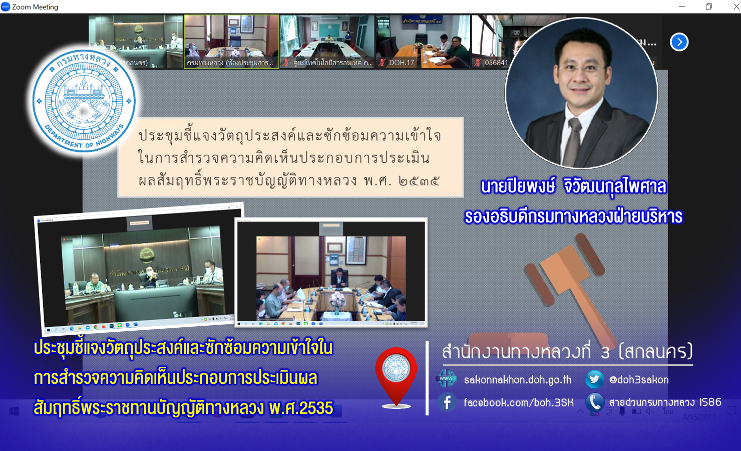 สำนักงานทางหลวงที่ 3 (สกลนคร) นายพัลลภ จันทร์งามปภากูล ผู้อำนวยการสำนักงานทางหลวงที่ 3 พร้อมด้วยนายวุฒิพงศ์ คำภูแสน รองผู้อำนวยการสำนักงานทางหลวงที่ 3 ตำแหน่งที่ 1 นายประวัติ เสวตวงษ์ รองผู้อำนวยการสำนักงานทางหลวงที่ 3 ตำแหน่งที่ 2 นายหนูกาญ เจริญไชย ผู้อำนวยการส่วนกฎหมายและกรรมสิทธิ์ที่ดิน นางนภาพิศ สุวรรณศรี ผู้อำนวยการส่วนบริหารงานทั่วไป นายอำนาจ สาไชยันต์ ผู้อำนวยส่วนเทคโนโลยีสารสนเทศ นายวีรวัฒน์ บุ่งนาแซง นิติกรปฏิบัติการ และเจ้าหน้าที่ที่เกี่ยวข้องร่วมประชุมชี้แจงวัตถุประสงค์และซักซ้อมความเข้าใจในการสำรวจความคิดเห็นประกอบ การประเมินผลสัมฤทธิ์พระราชทานบัญญัติทางหลวง พ.ศ.2535 ผ่านระบบ Zoom Cloud Meeting ณ ห้องประชุมทวีพัฒน์ ตินะมาส อาคารหลังใหม่
