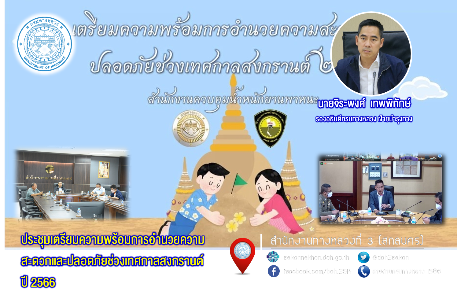 นายจิระพงศ์ เทพพิทักษ์ รองอธิบดีกรมทางหลวง ฝ่ายบำรุงทาง เป็นประธาน ประชุมเตรียมความพร้อมการอำนวยความสะดวกและปลอดภัยช่วงเทศกาลสงกรานต์ 2566 โดยผ่านระบบ Zoom Cloud Meeting จากห้องประชุมสารศาสตร์ศิริลักษณ์ ชั้น 2 พหลโยธิน กรมทางหลวง เพื่อเป็นการเตรียมความพร้อมในการอำนวยความสะดวกและปลอดภัยในการเดินทางของประชาชนช่วงเทศกาลสงกรานต์ 2566 ระหว่างวันที่ 11 - 17 เมษายน 2566 (7 วันอันตราย)
